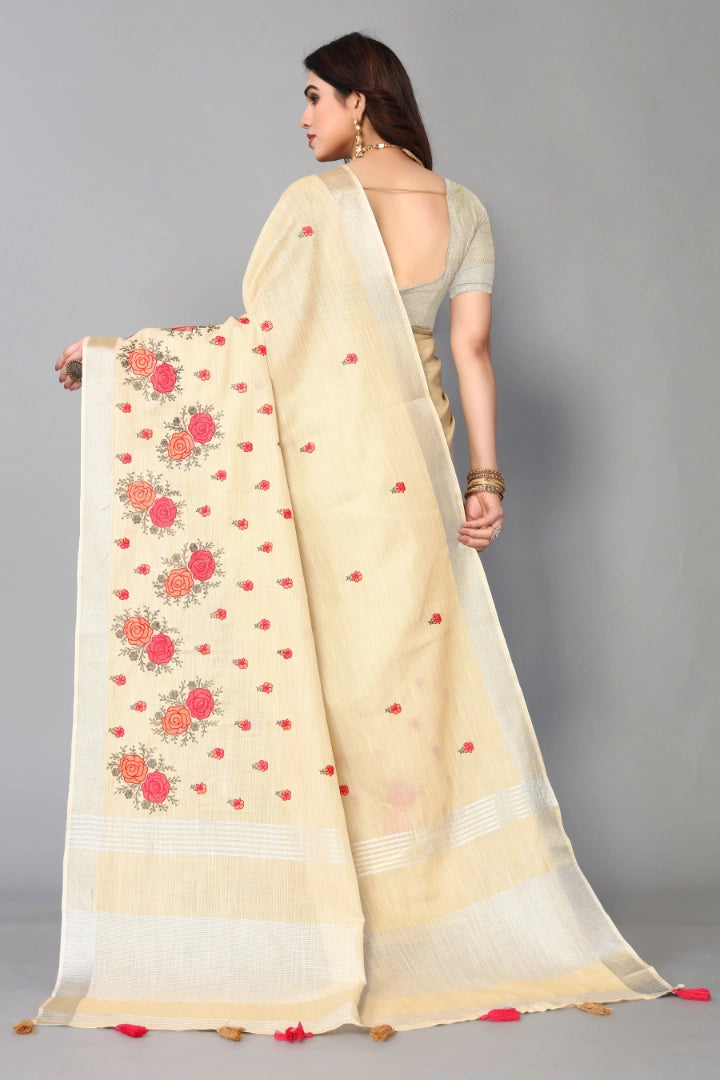 This pure cotton silk saree is soft, breathable, and elegant. It features a beautifully embroidered gold zari pallu that adds a rich, traditional touch. The fabric drapes well and feels comfortable all day. Perfect for festive and special occasions.
