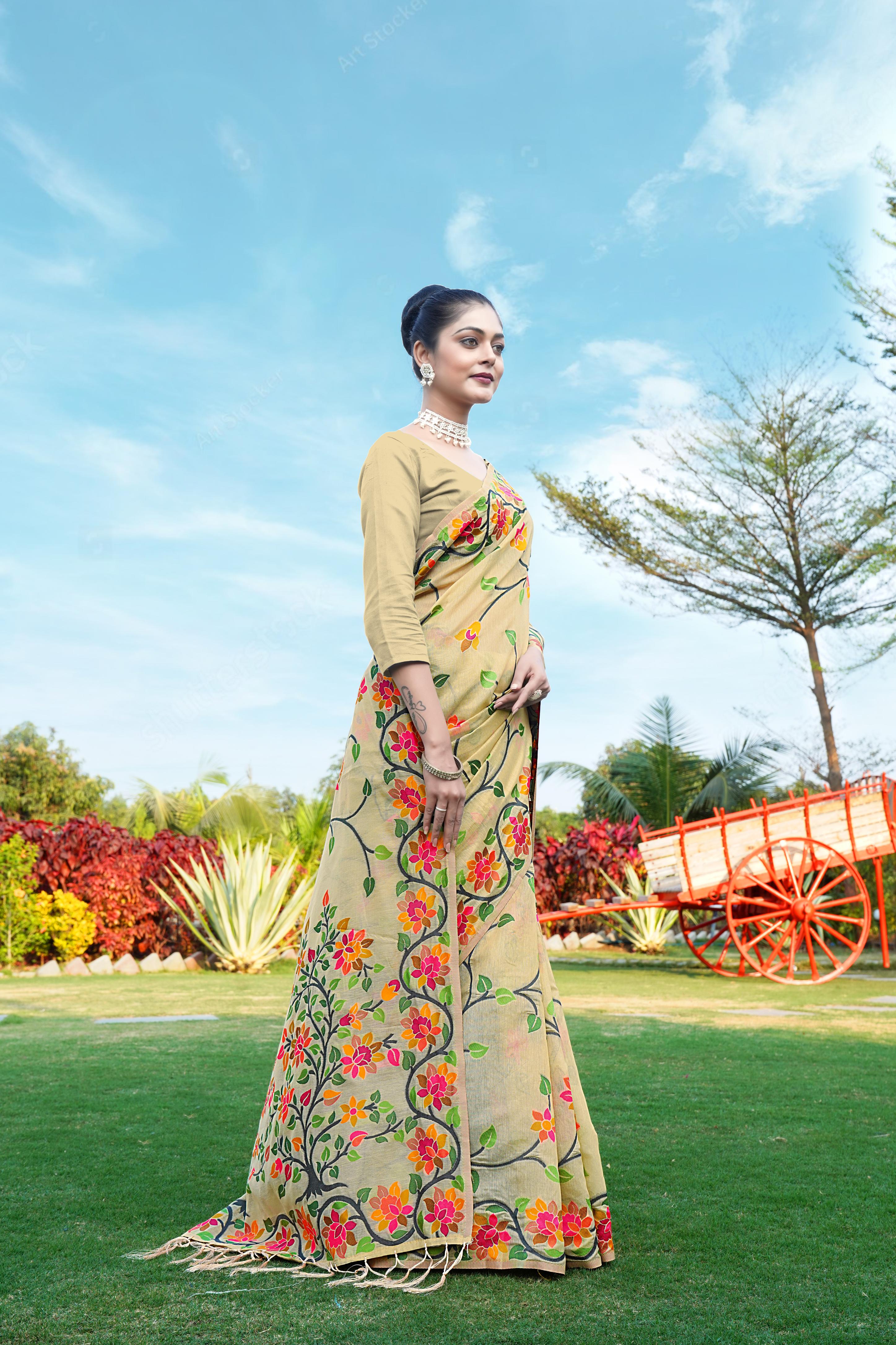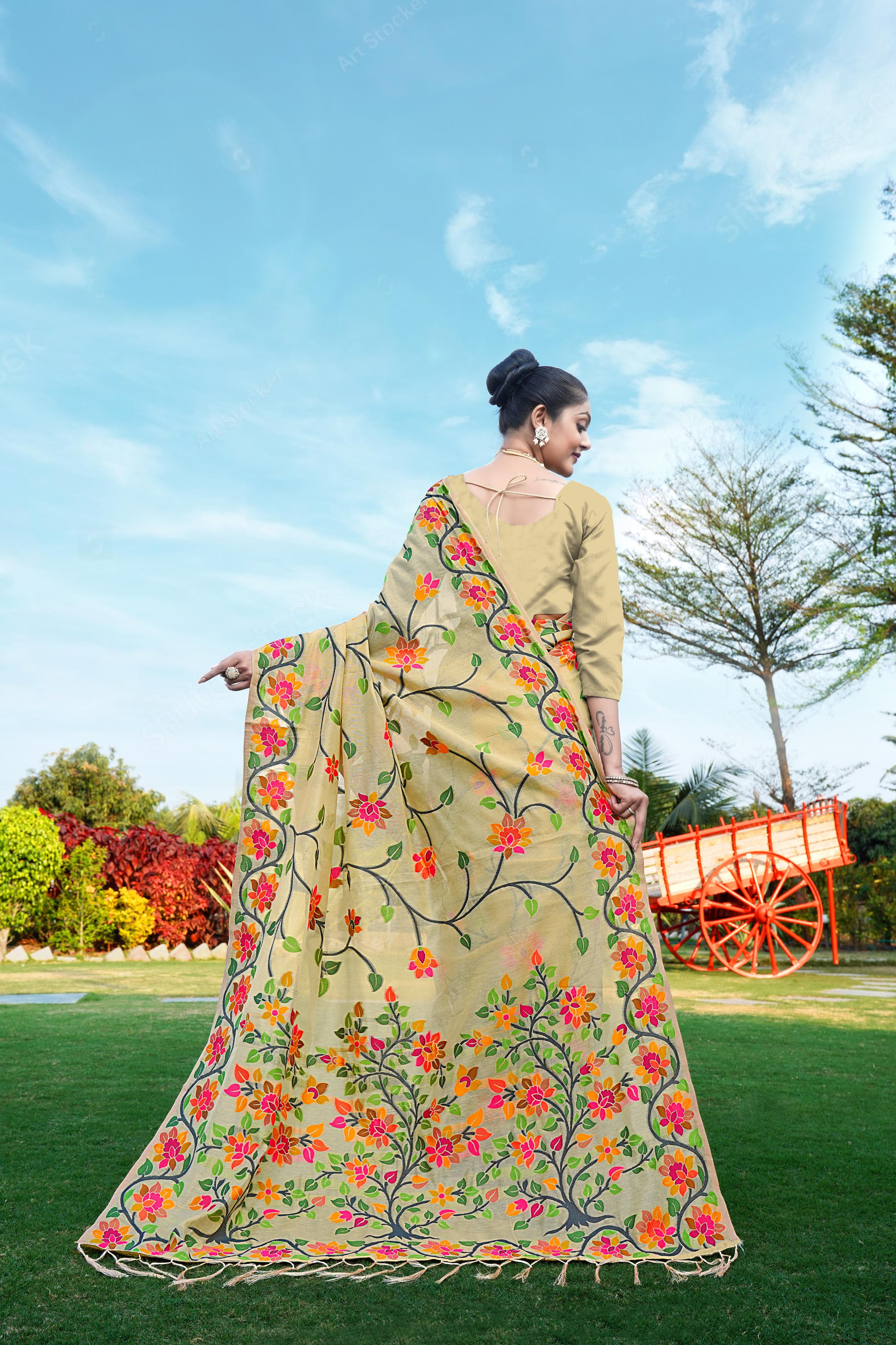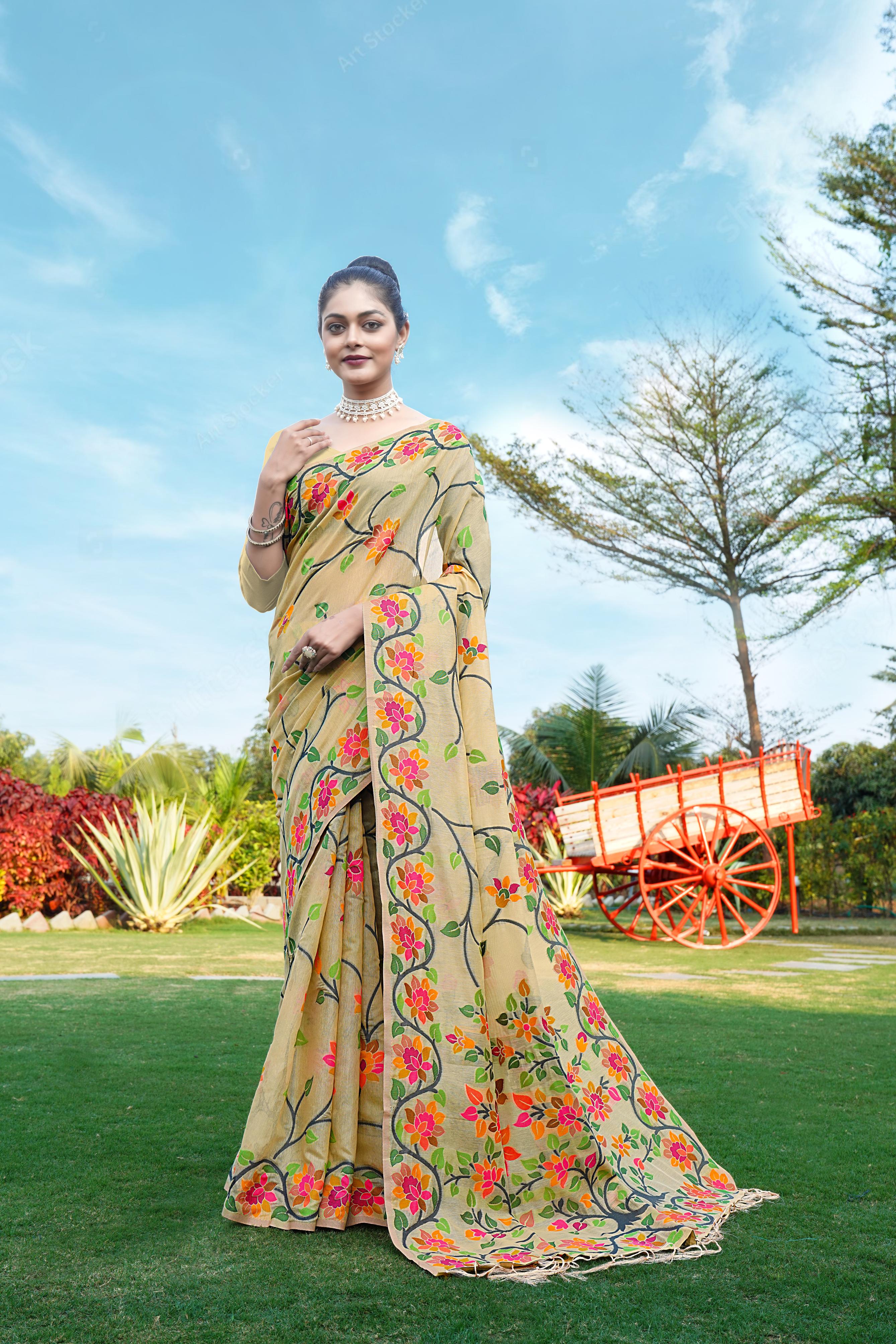 Our BEIGE Floral Jamdani Saree is a perfect blend of tradition and elegance, with vibrant flower patterns woven into soft fabric. It offers a smooth, comfortable fit that works for both formal and casual events