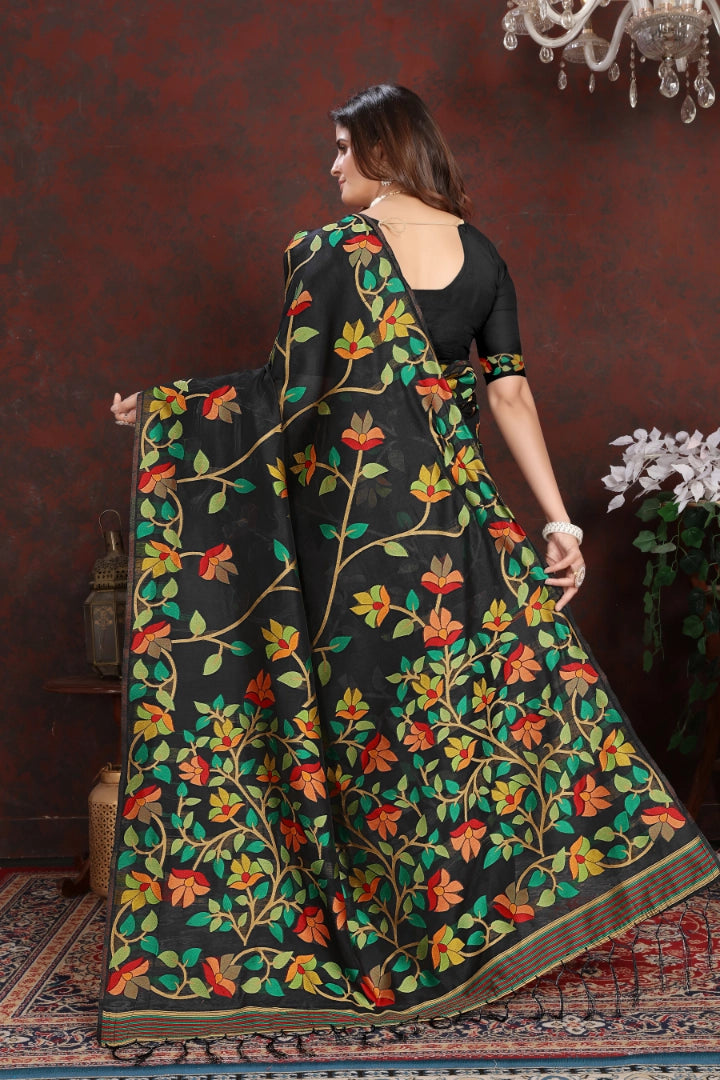Celebrate tradition with our BLACK Floral Jamdani Saree, decorated with pretty flower designs that add a special touch. Made from soft, lightweight fabric, it drapes easily and feels comfortable all day.
