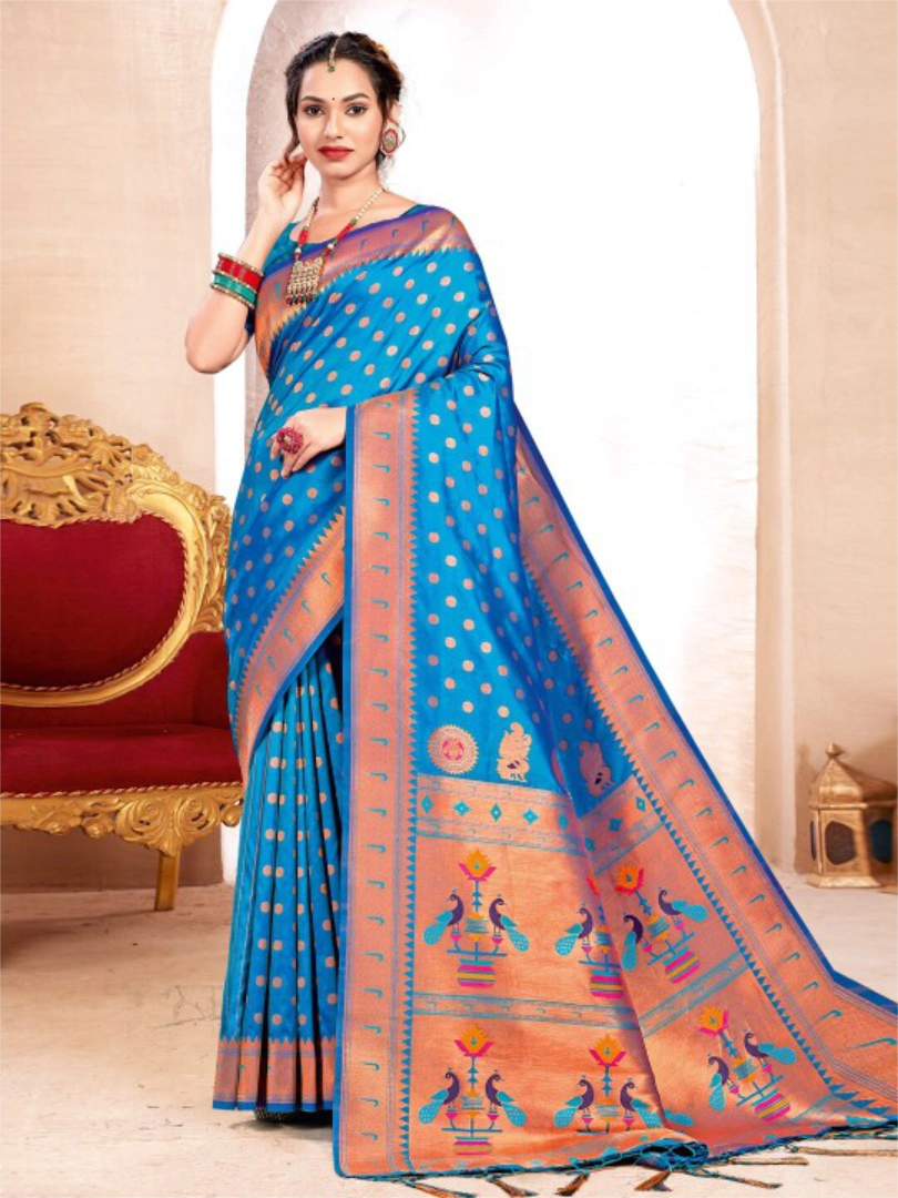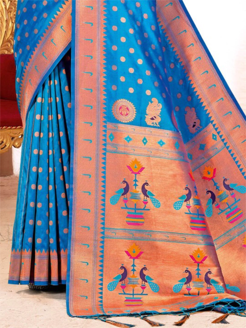 This Blue Paithani Saree features rich zari weaving, delicate butti motifs, and a striking peacock pallu. A timeless pick for Navratri and festive occasions, the saree features intricate butti motifs across the body and a richly woven pallu with peacock and kalash designs