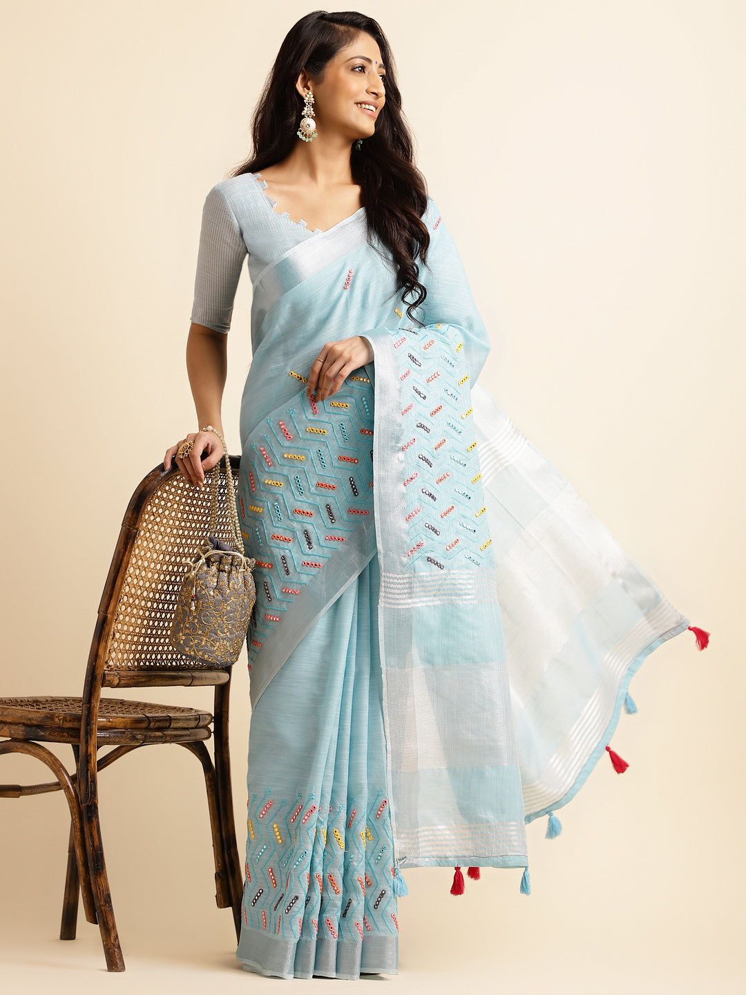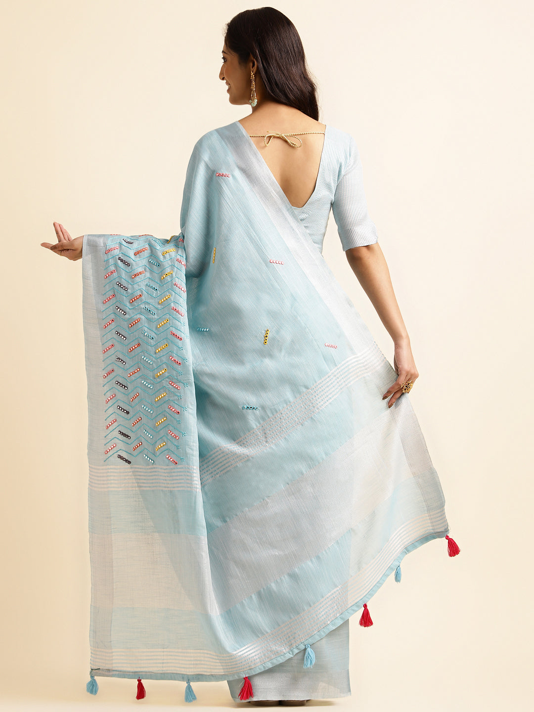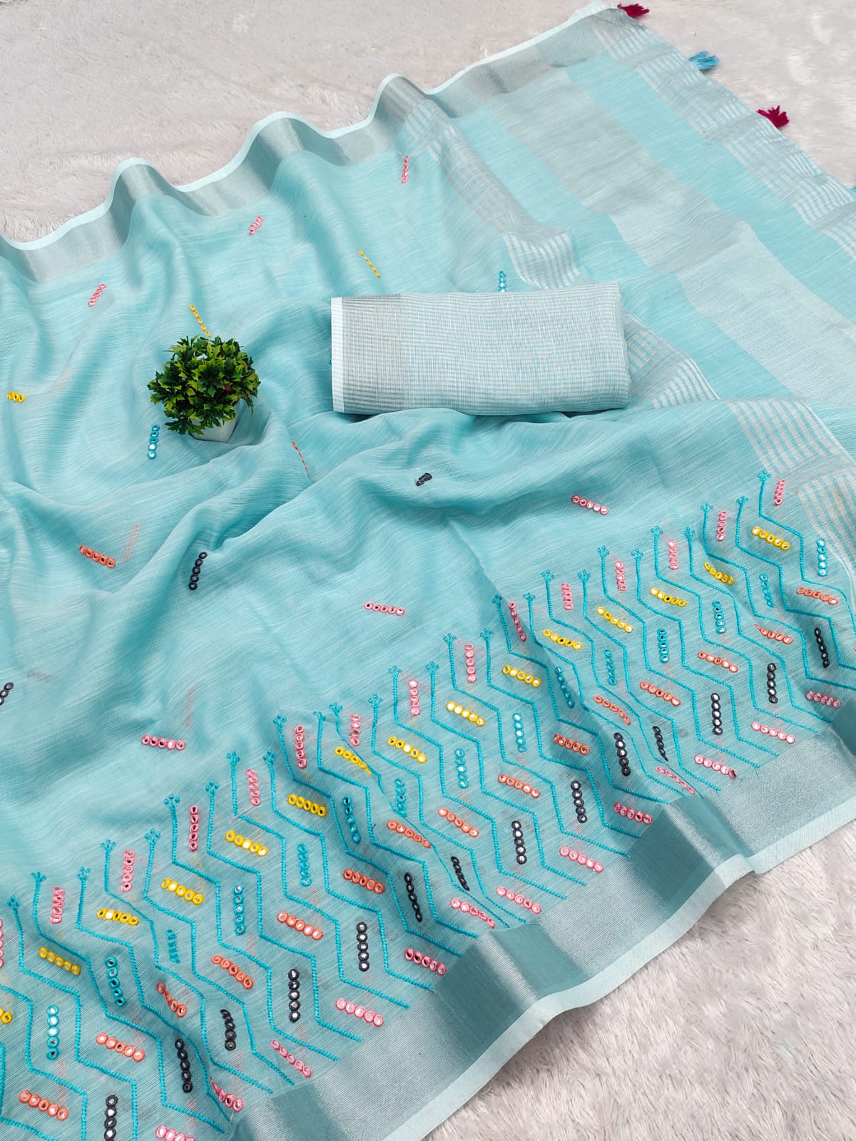 A linen mirror work saree is a stunning blend of traditional and contemporary style mirror work adds sparkle and shine to the fabric, creating a unique, eye-catching look. Perfect for festive events or celebrations.