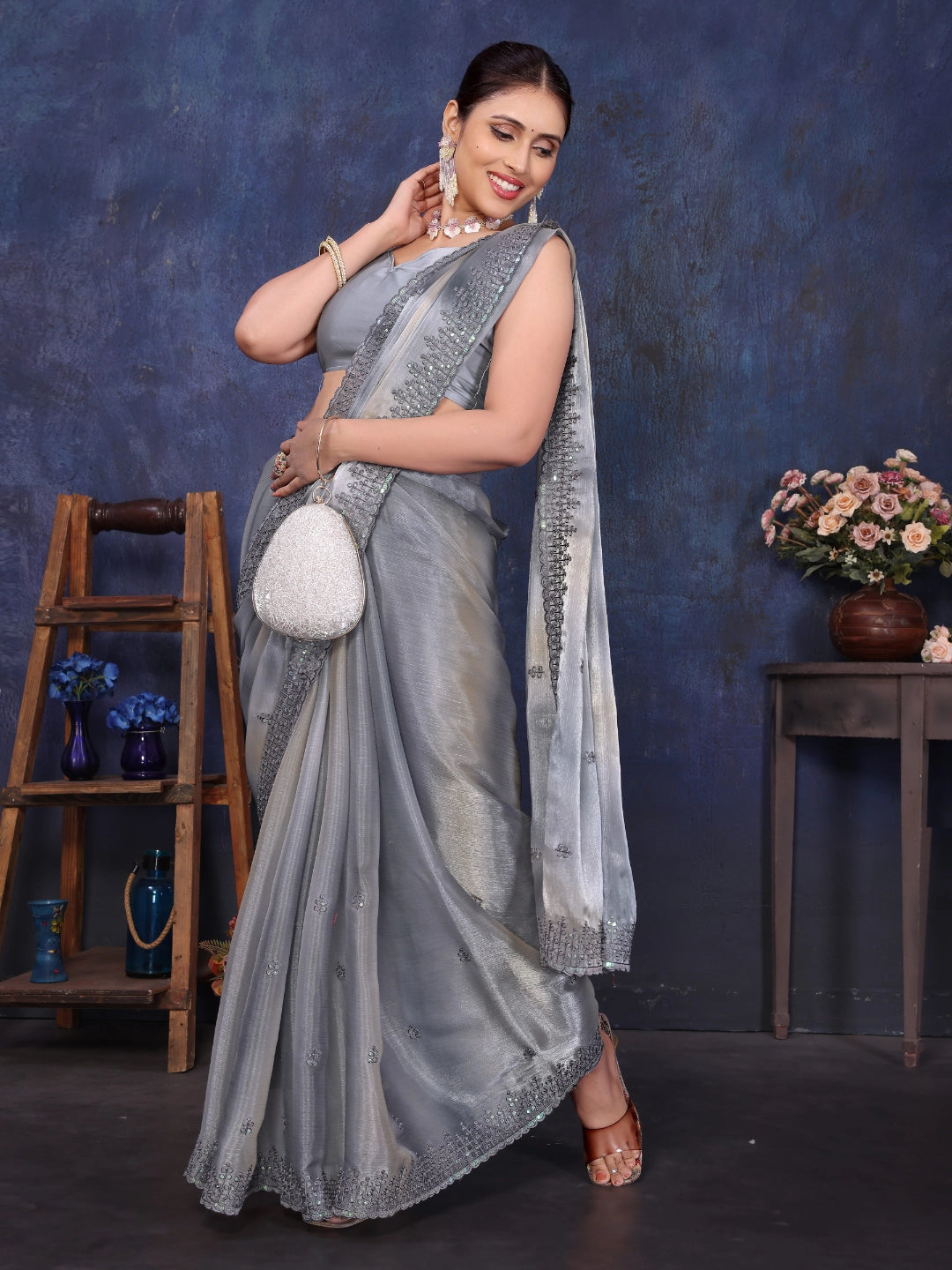 The Grey Pure and Soft Jimmy Choo Designer Saree exudes elegance with its silk blend fabric, offering a soft, shiny finish. Adorned with exquisite sequence and thread work, it pairs beautifully with a silver blouse piece, making it a perfect choice for festivals, weddings, and grand celebrations.