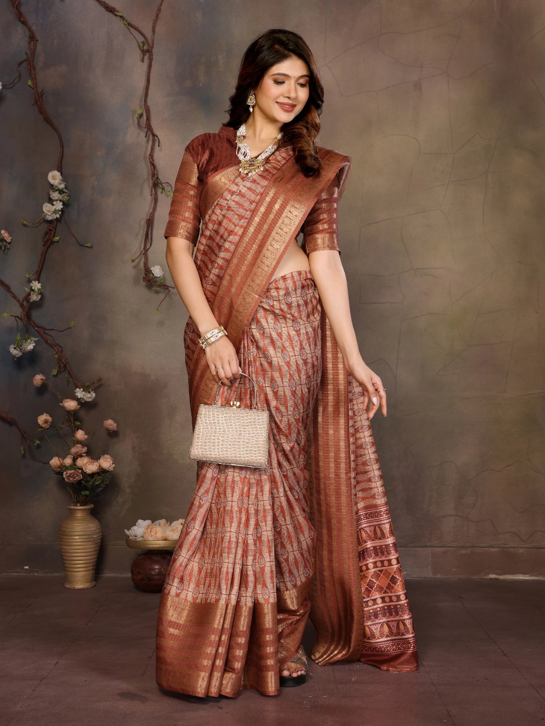 Step into timeless elegance with this Banarasi Jacquard saree featuring bold geometric digital prints. The soft jacquard fabric is woven with subtle shine and classic Banarasi-style motifs, offering a perfect blend of tradition and modern aesthetics.
