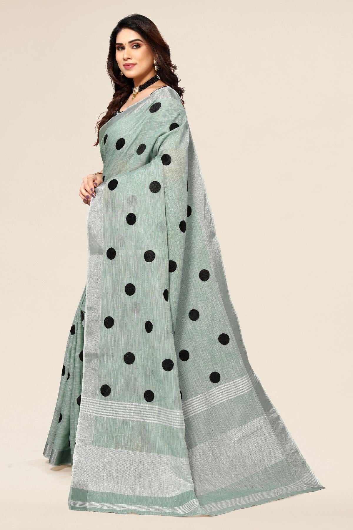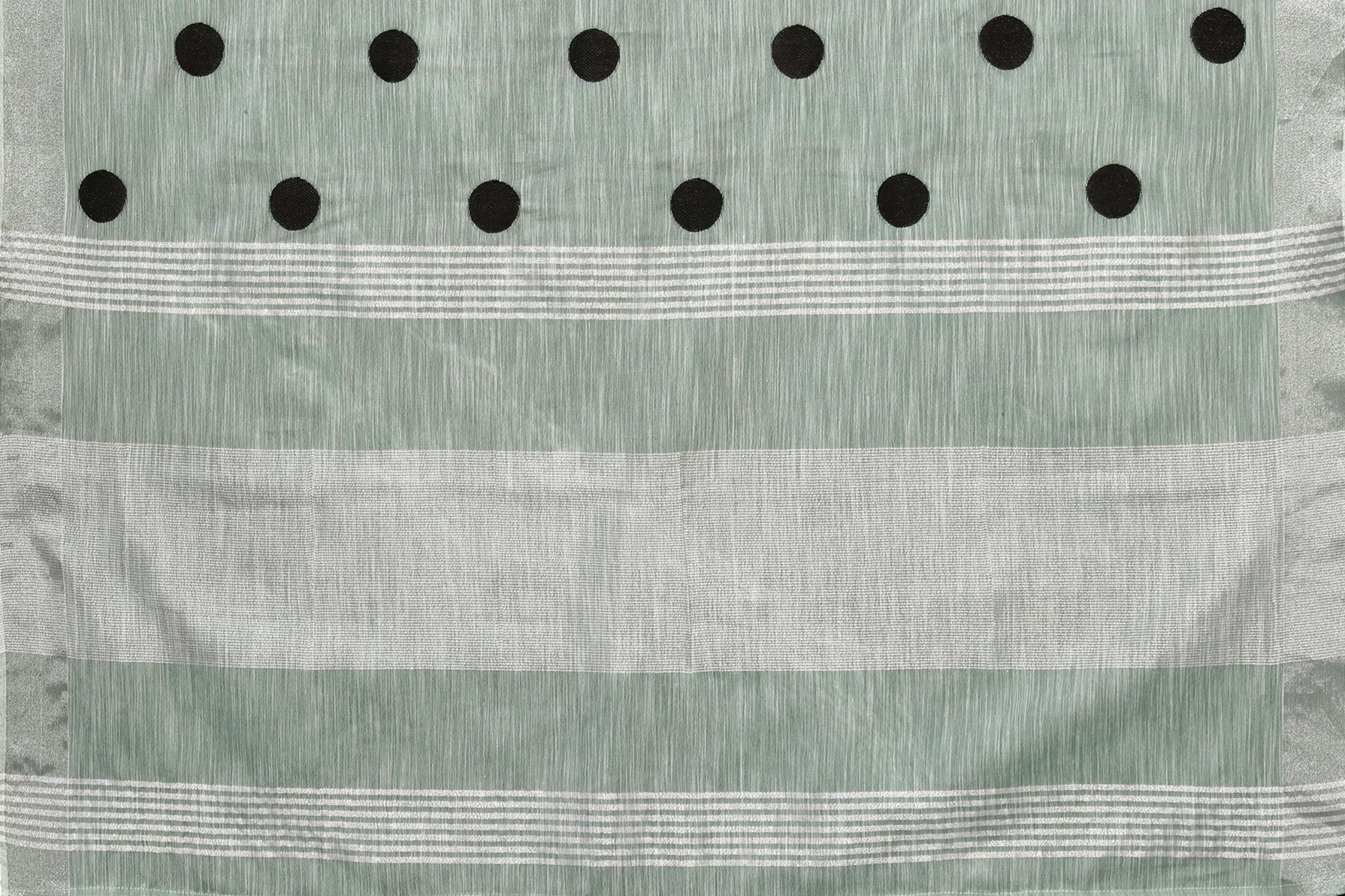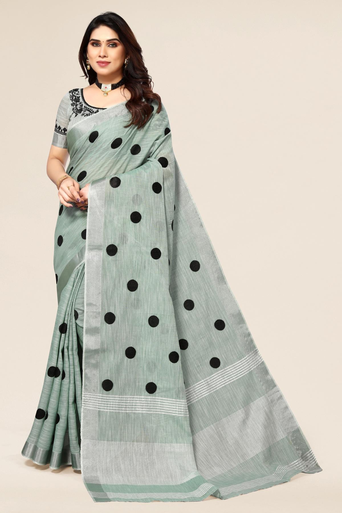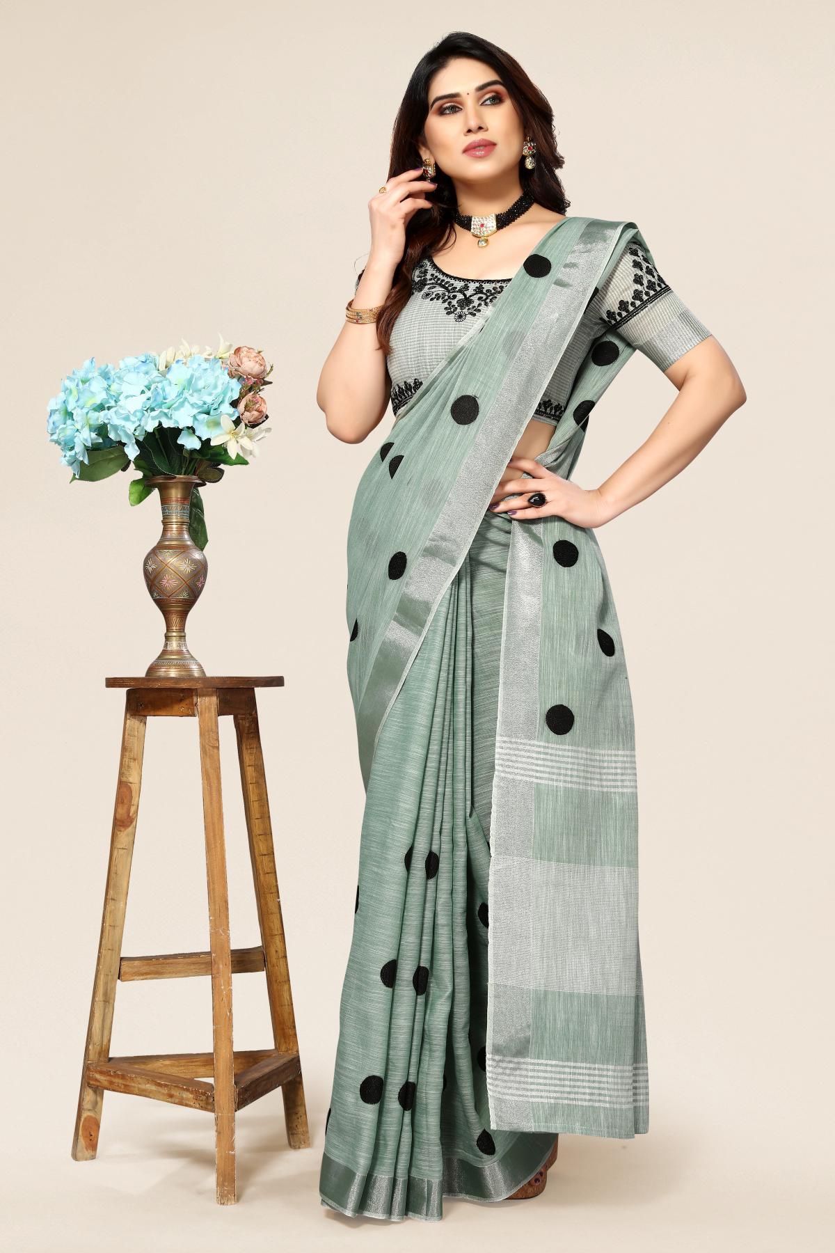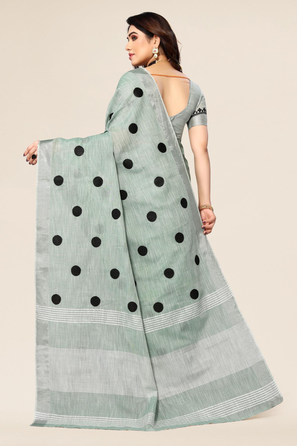 A linen embroidered polka saree is a traditional Indian garment made from linen fabric that features embroidered polka dots.