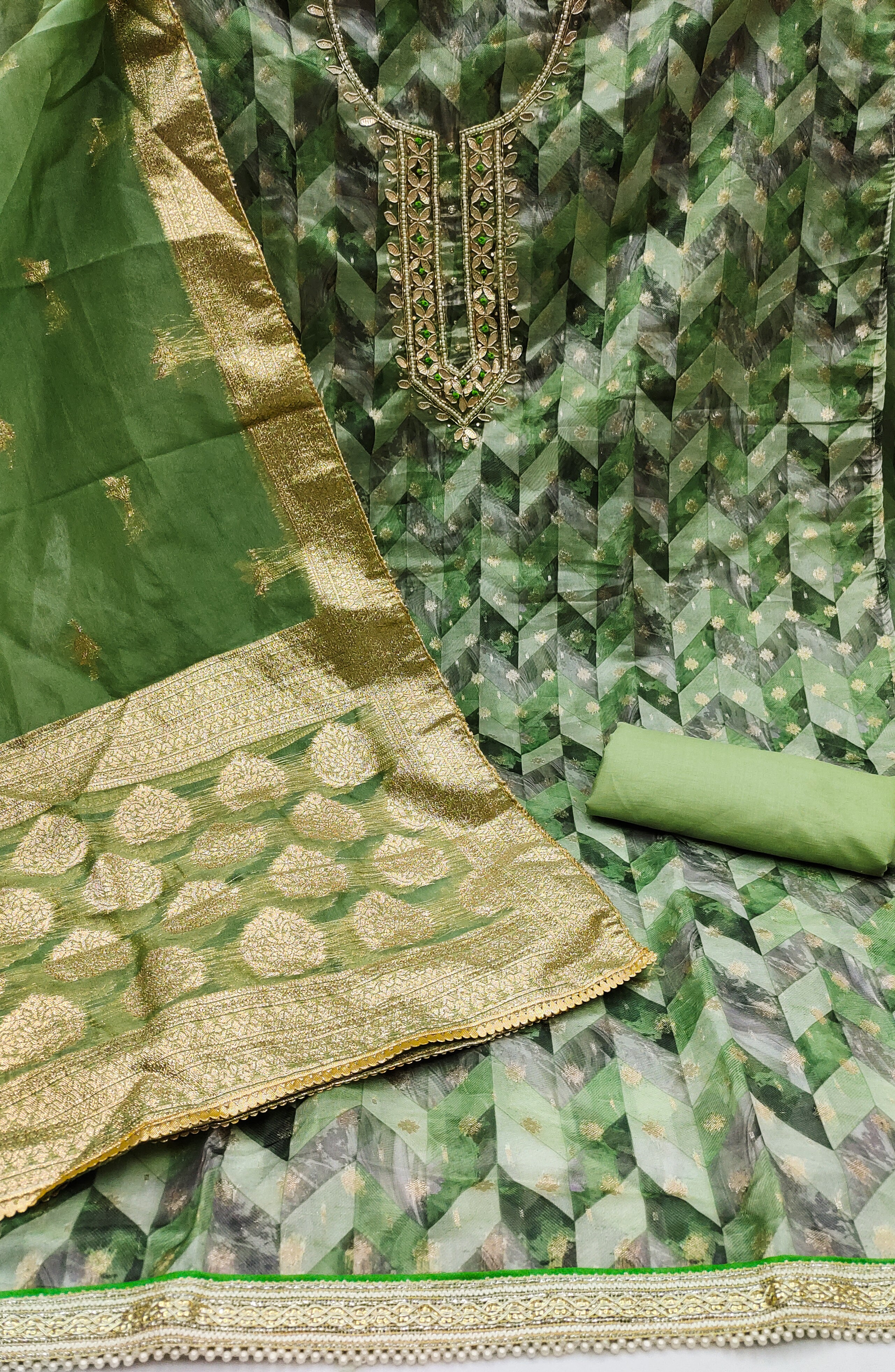 This 3-piece unstitched suit set brings together rich Banarasi weaving and delicate handwork on soft organza — perfect for those special occasions where you want to shine without trying too hard.
