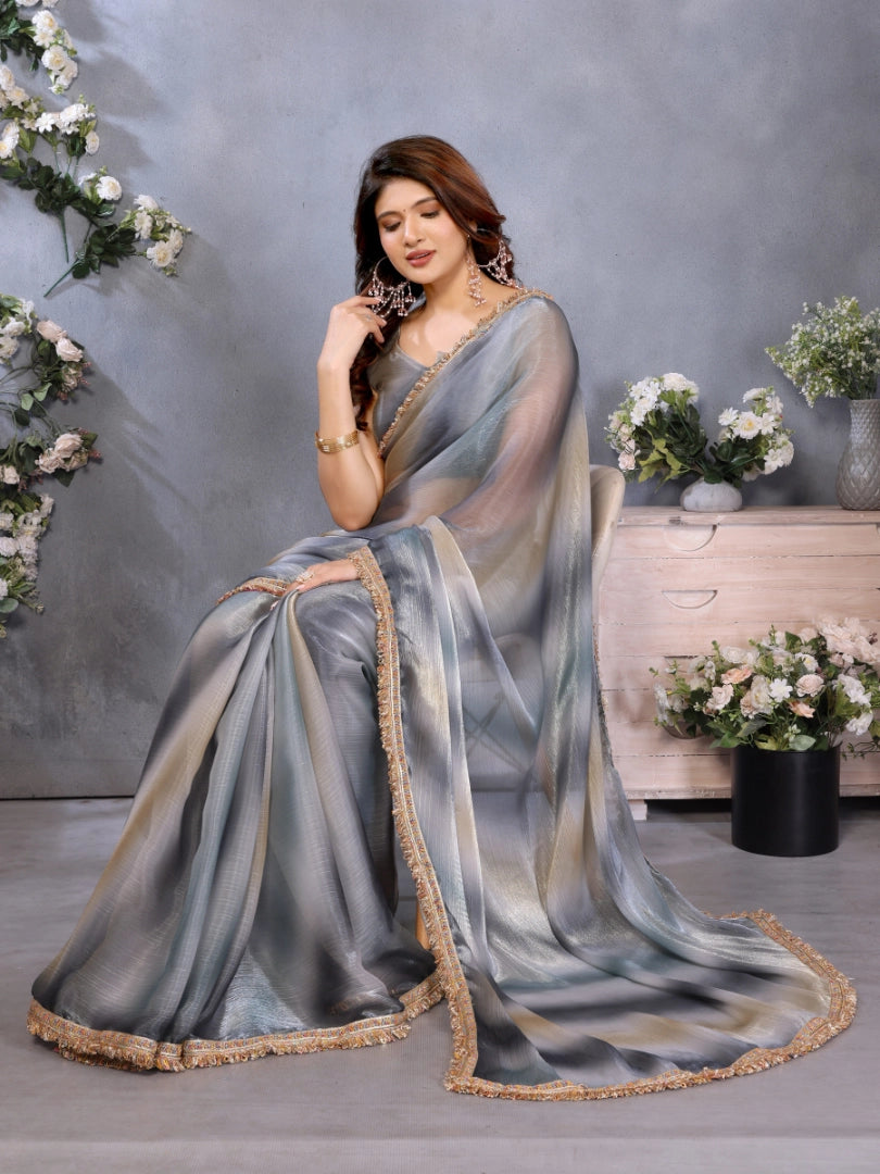 Indulge in the soft, glossy charm of satin silk finished with a delicate sequin-embroidered border. The fluid drape and subtle shimmer make it a perfect choice for festive evenings, celebrations, or wedding functions. Lightweight yet striking.