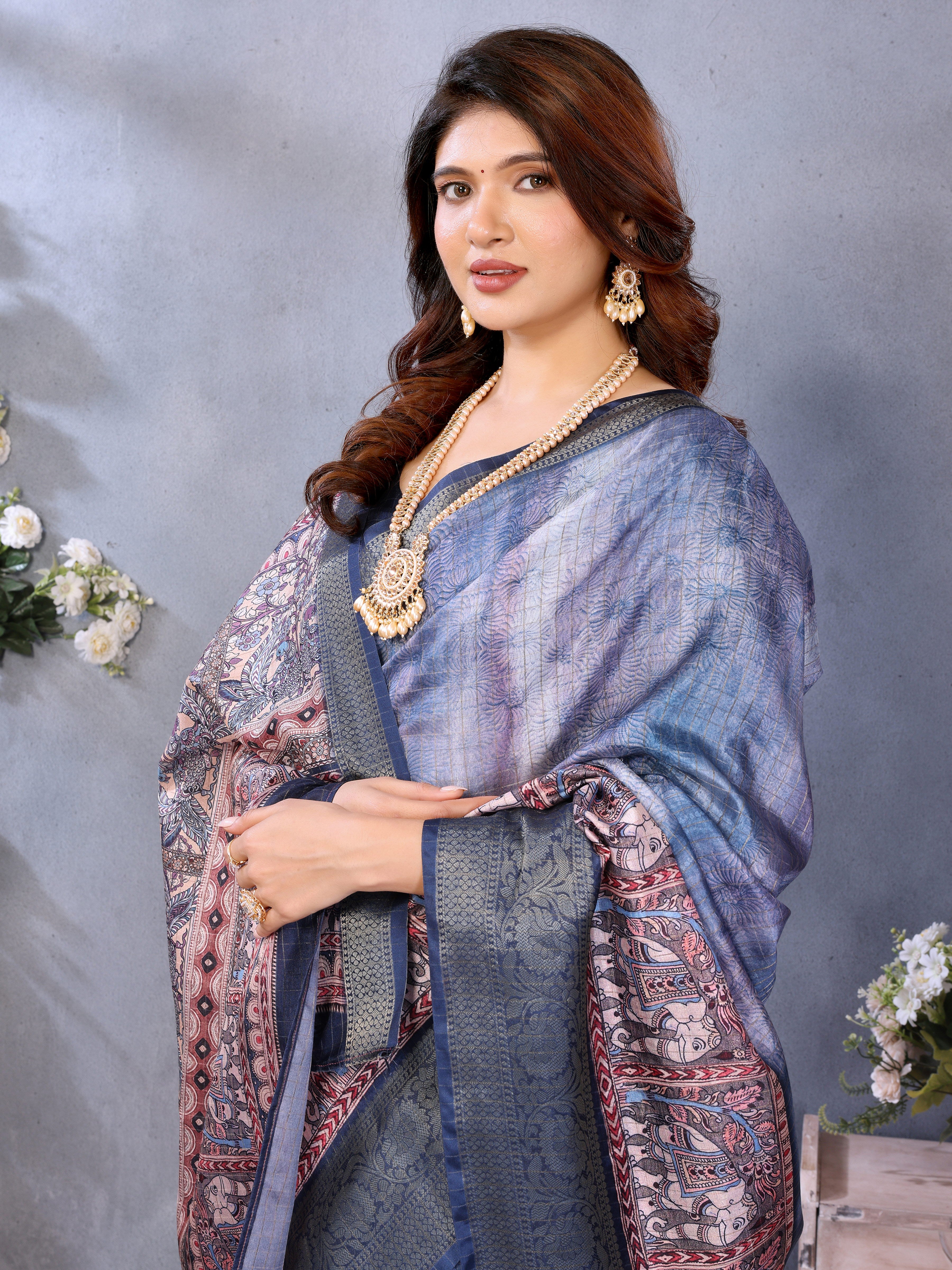 Inspired by traditional Kalamkari art, this saree features digitally printed elephants, peacocks, and floral motifs that celebrate Indian heritage. While digitally rendered, the design holds the intricate detailing and folk essence of classic Kalamkari work.