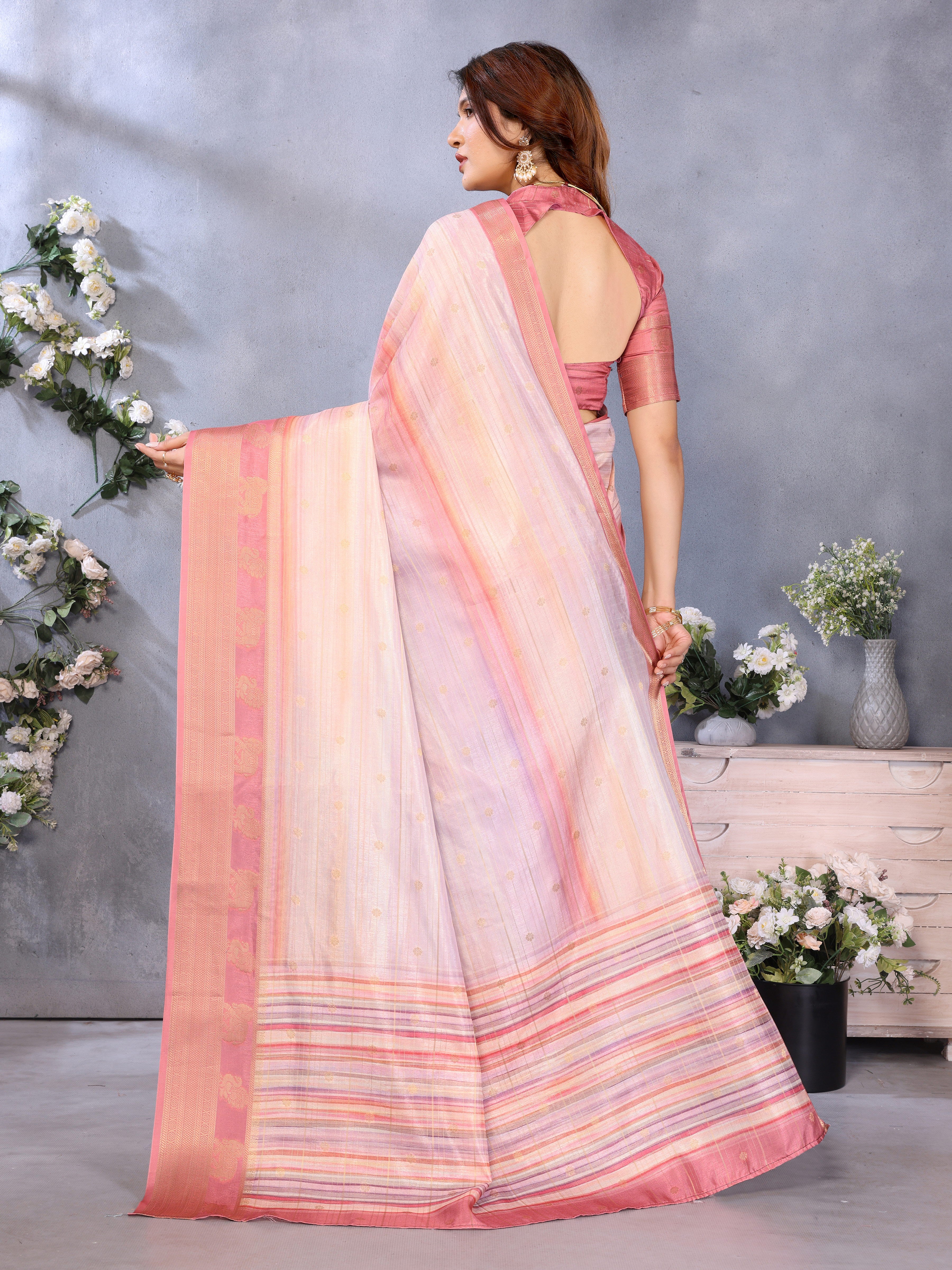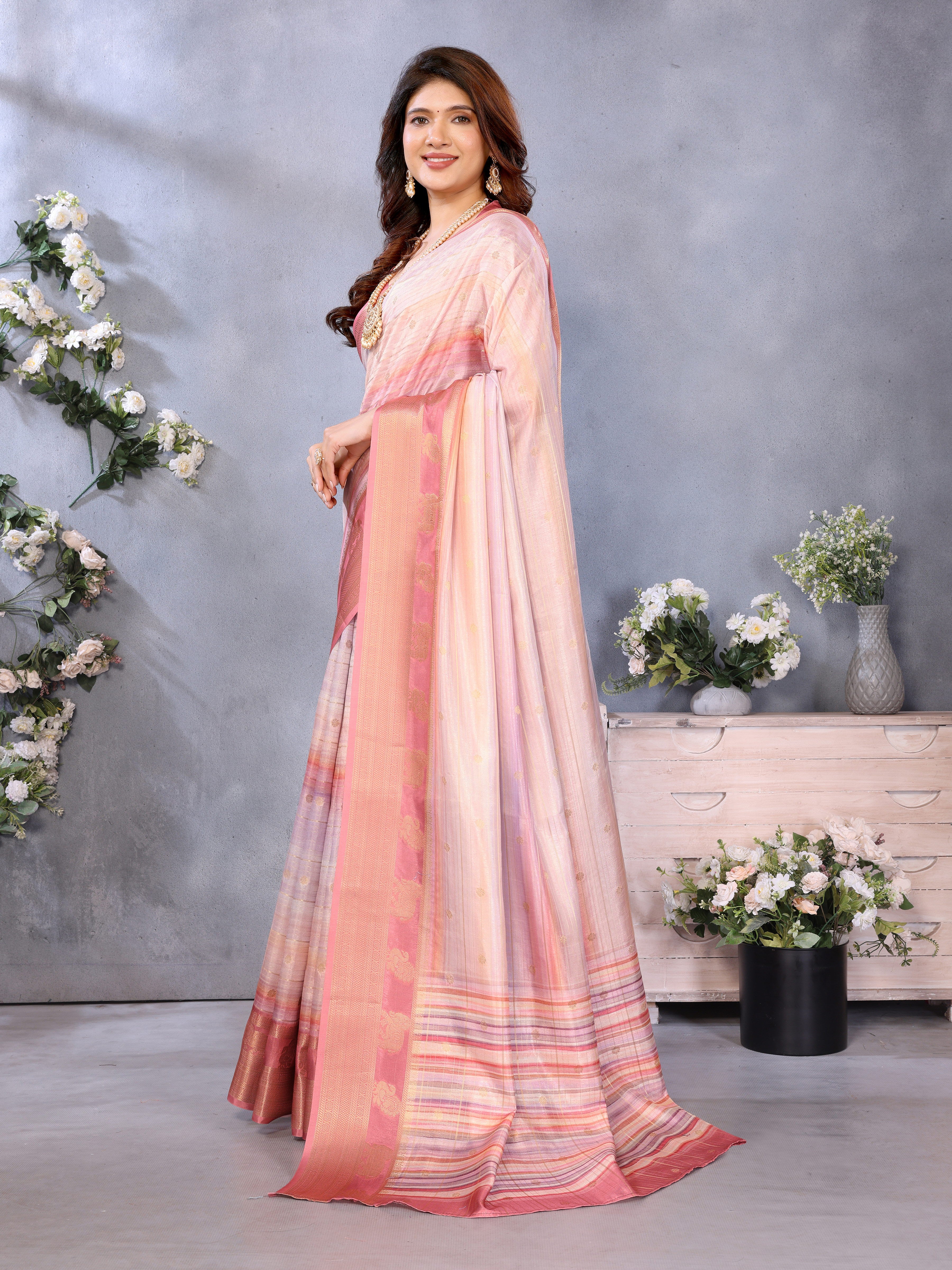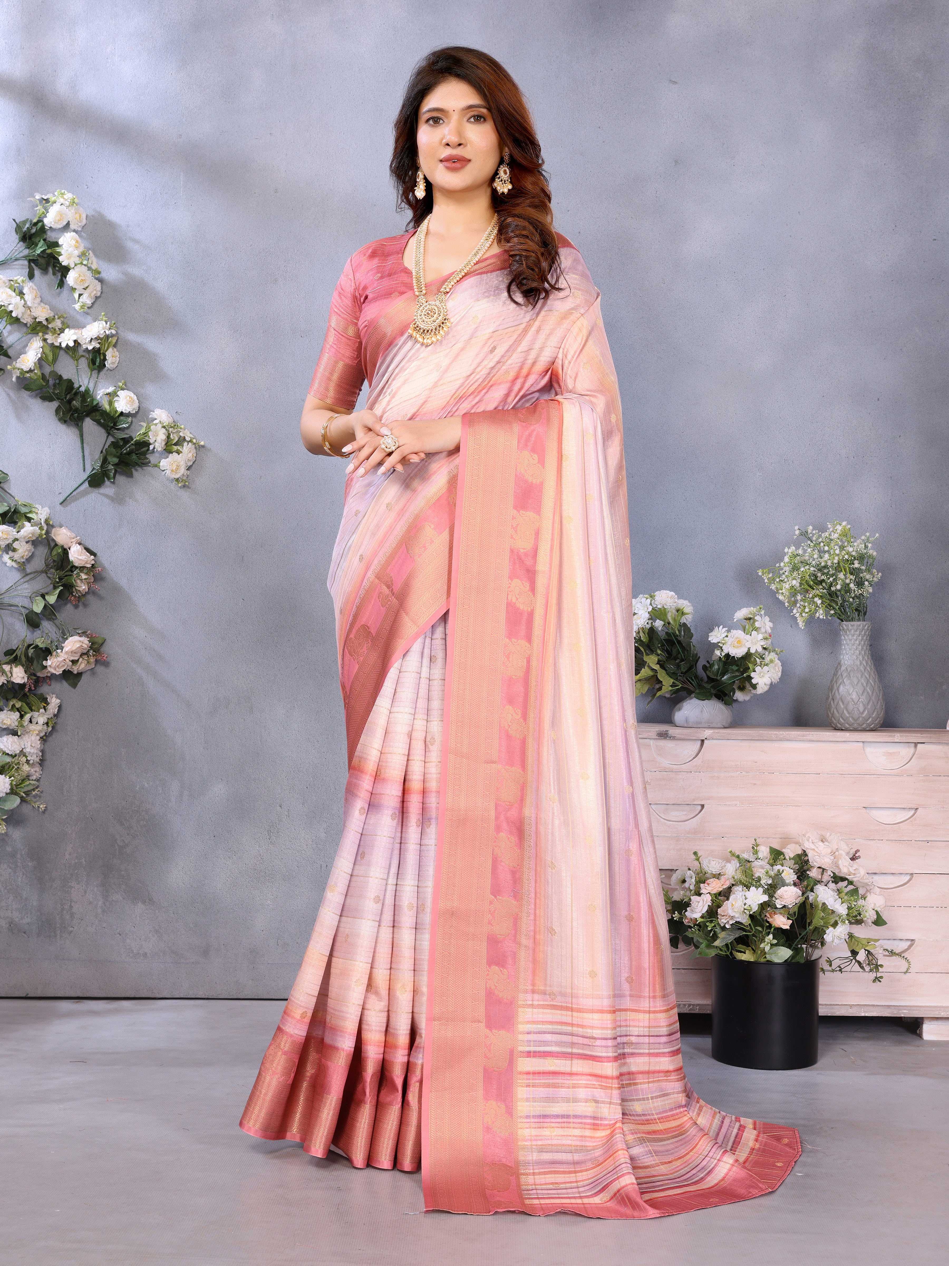 This Banarasi Jacquard saree features a modern striped digital print that blends tradition with a touch of trend. The fine jacquard weave adds depth and texture, while the digital stripes create a sleek, flattering fall. Lightweight yet rich in look, it's perfect for casual celebrations, festive events, or even elegant daywear.