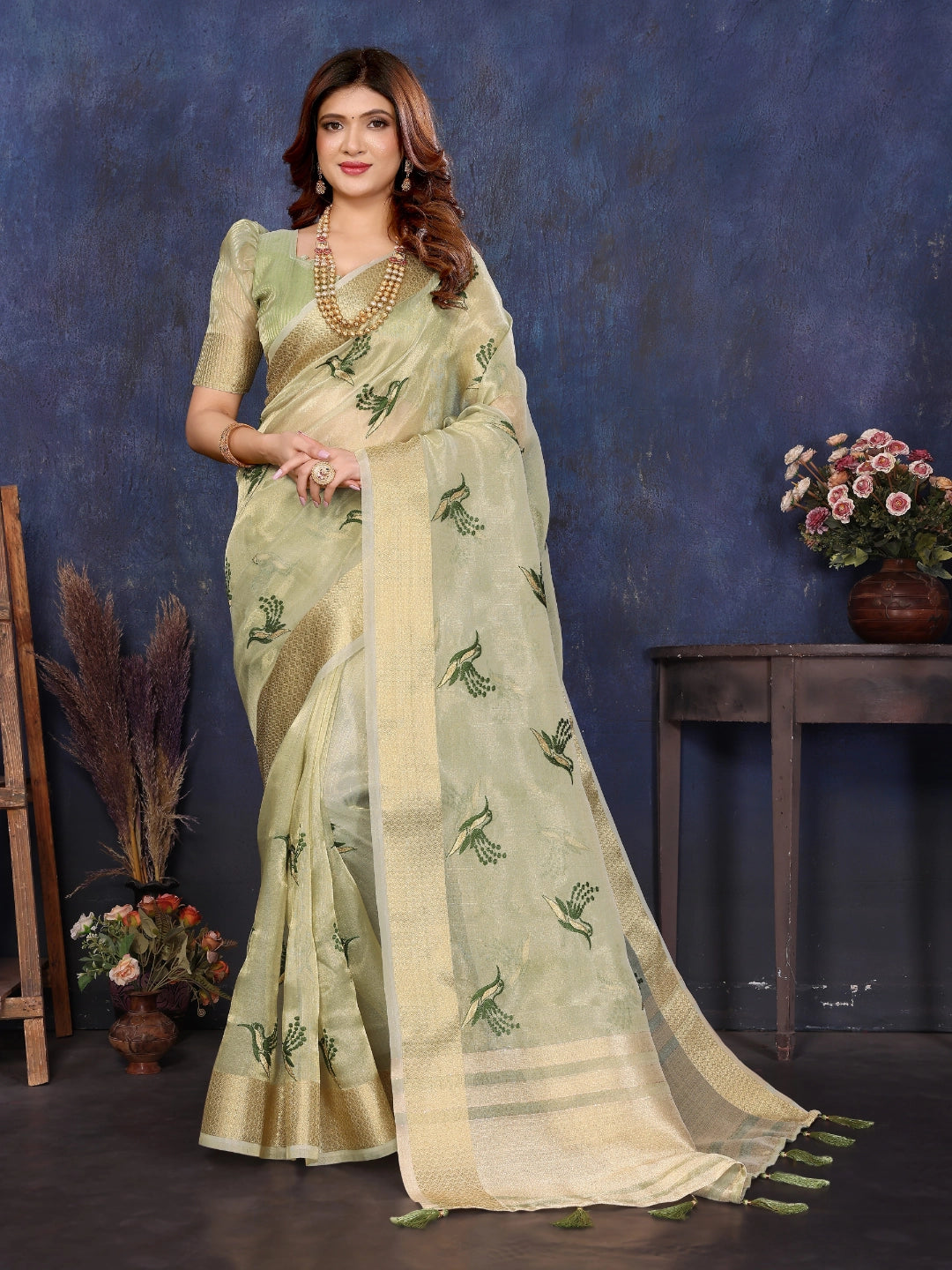 This viscose saree features elegant all-over thread work that adds a graceful and refined touch. The fabric is soft, smooth, and drapes beautifully, making it perfect for festive gatherings or special occasions.
