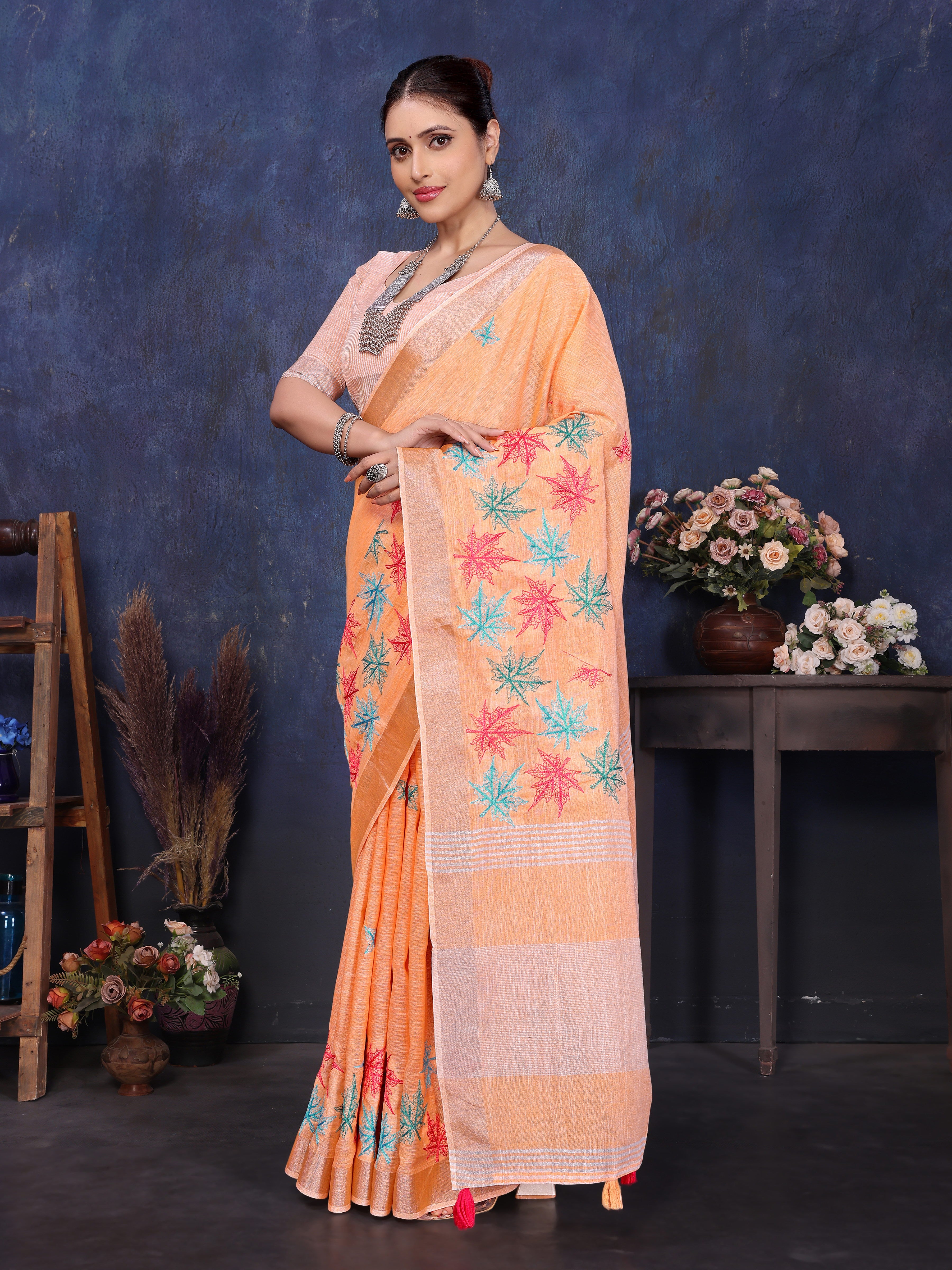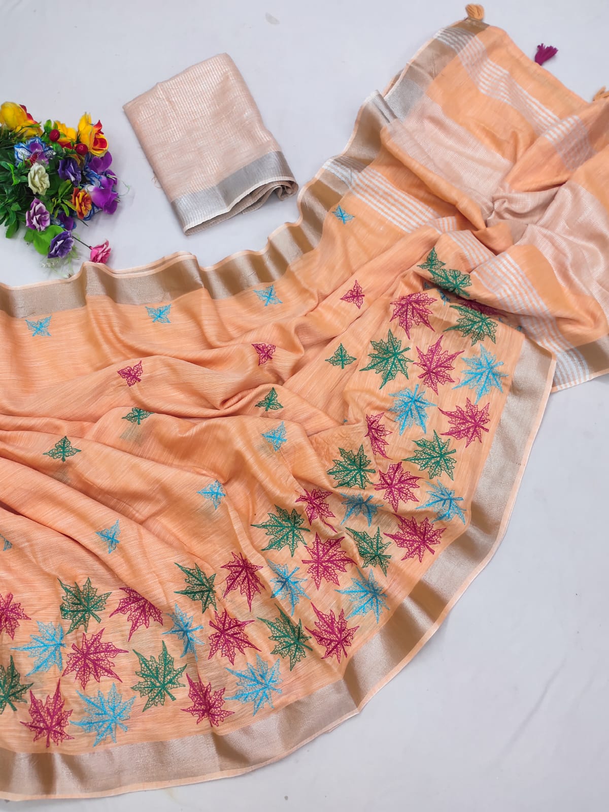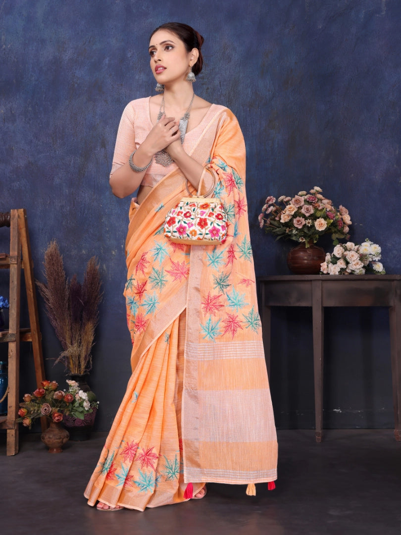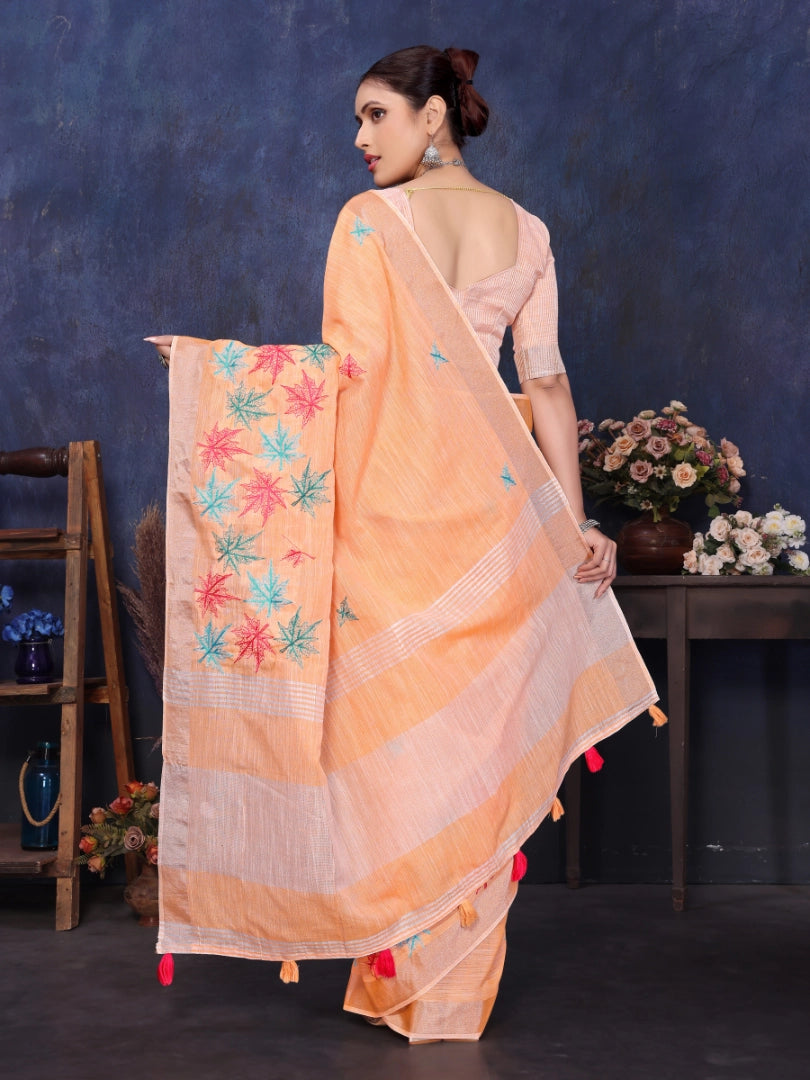 Linen saree known for being lightweight, breathable, and comfortable to wear, often preferred for its ease of wearing. Embroidery on linen sarees can range from delicate floral patterns to bold geometric designs, usually done with threads like silk, cotton, or zari (metallic threads).