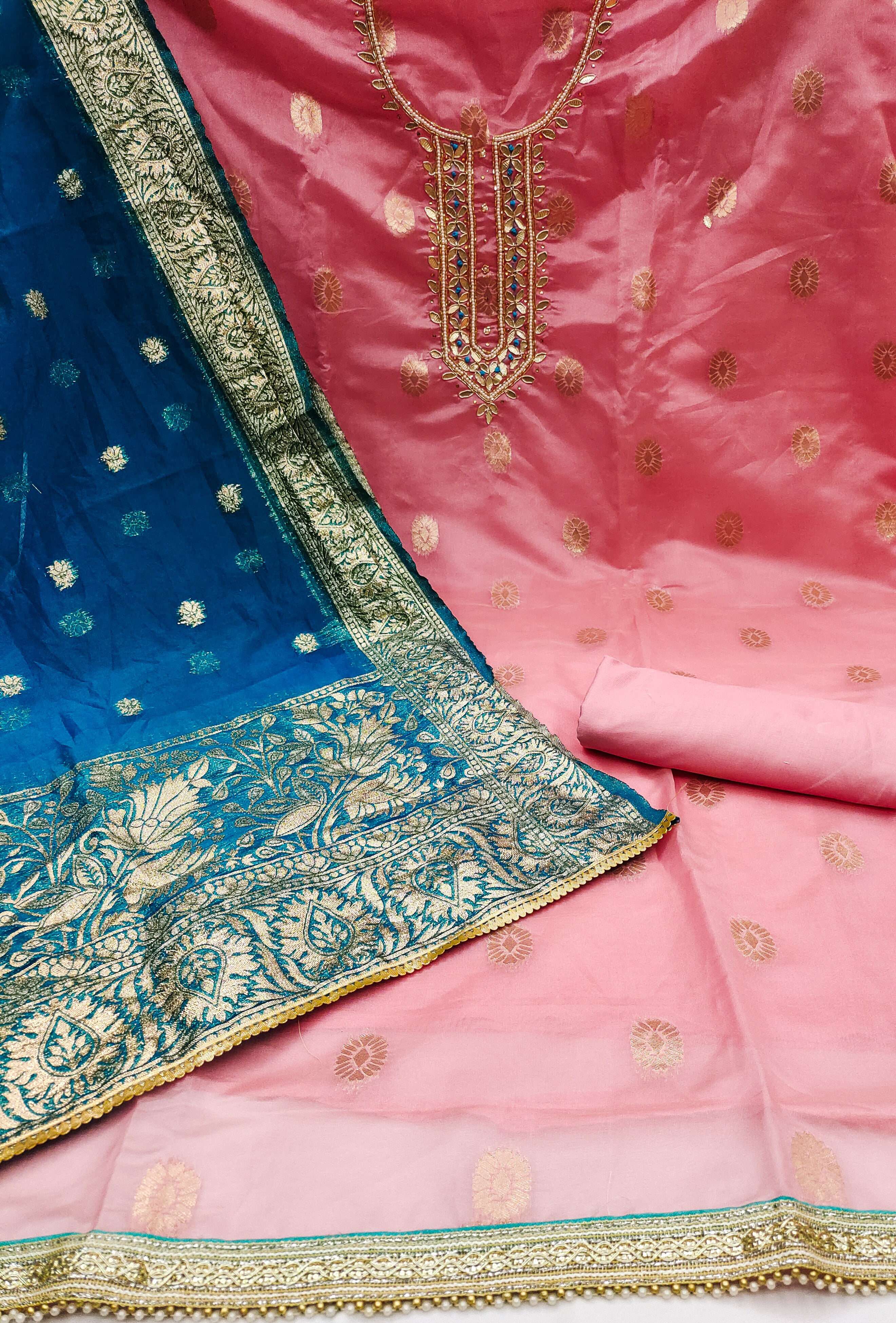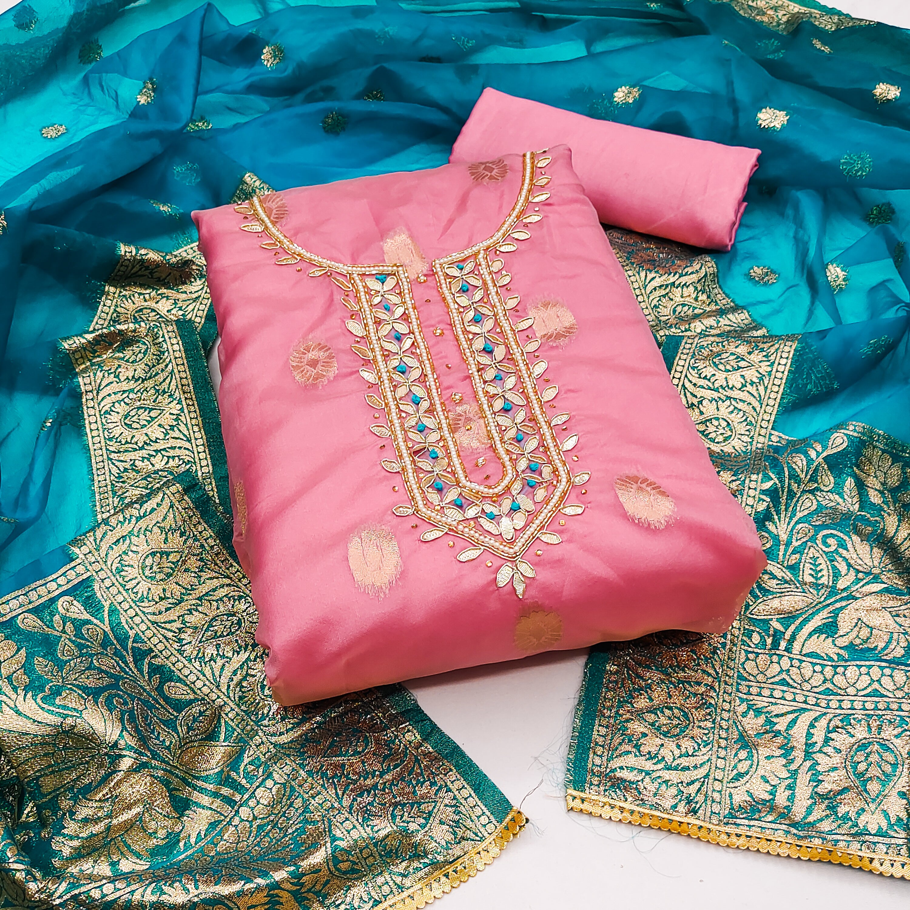 Light and elegant – this unstitched suit is made from organza fabric with soft handwork and beautiful banarasi-style designs. The dupatta adds a festive feel with its rich woven look. A lovely pick for family gatherings, festivals, or special days.