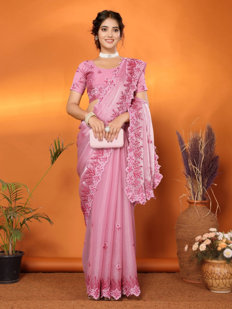 The Pink Jimmy Choo Floral Embroidery Saree is a beautiful mix of modern style and tradition. Made in a rich Pink color, it has detailed floral embroidery with a touch of sparkle. Designed with high-quality fabric, this saree is perfect for special occasions.