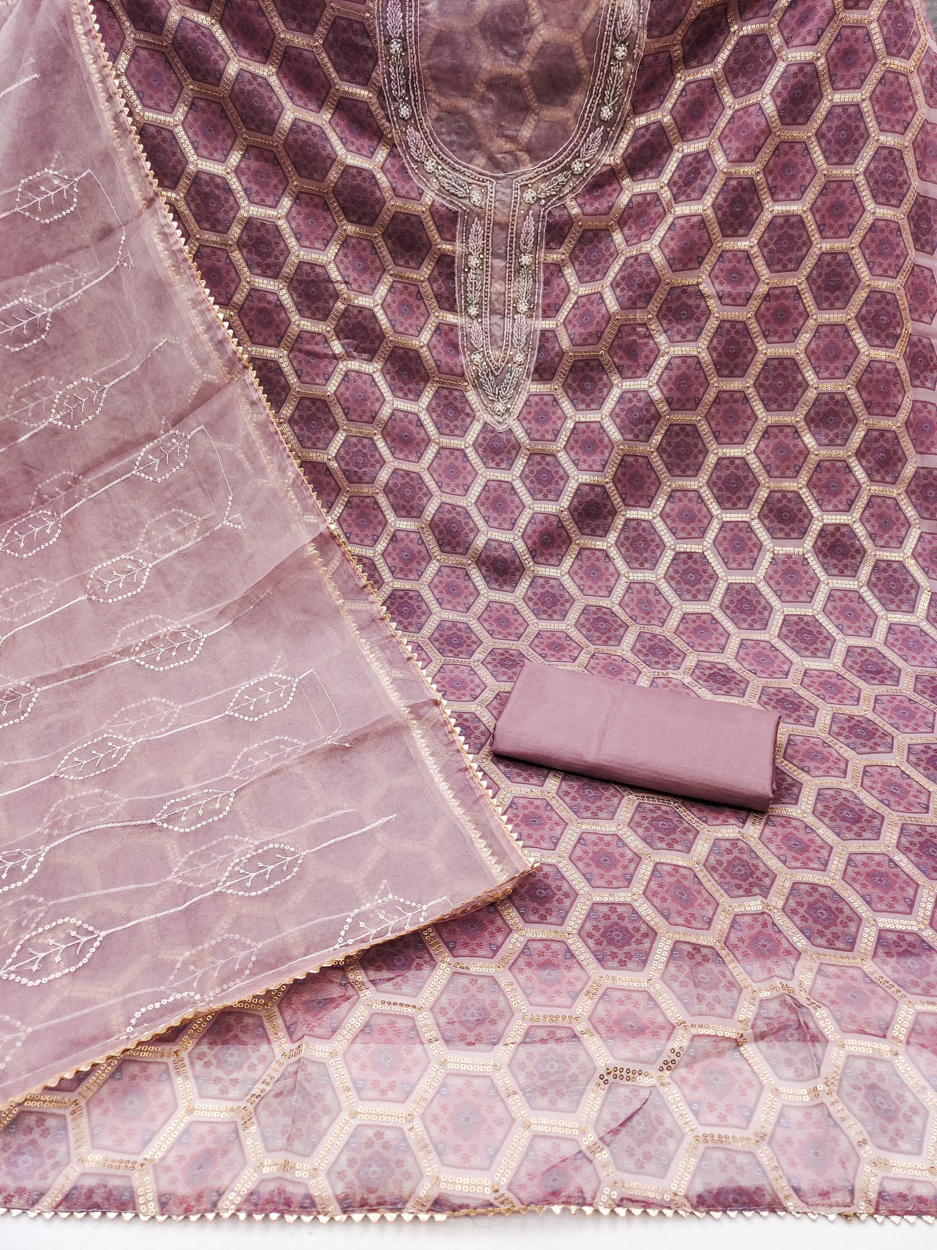 Graceful and light – this Pink organza suit is designed to make you feel special. It features neat handwork placed beautifully on the fabric. A lovely choice for festive events, family functions, or even a classy day out.