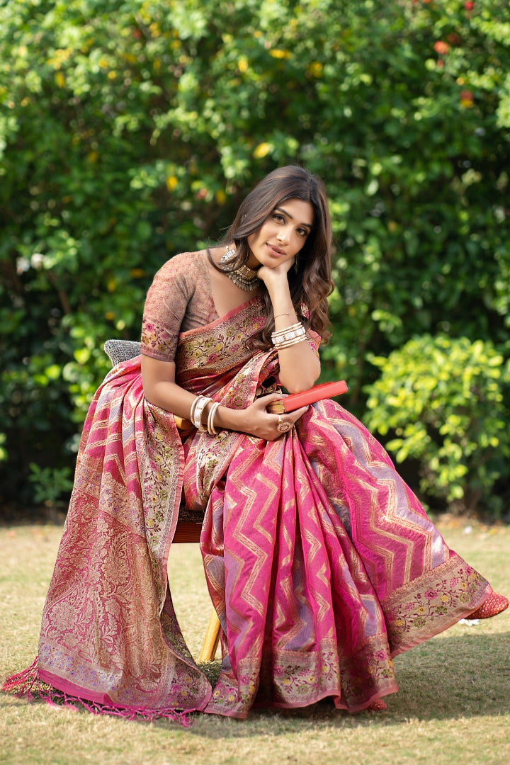 Lightweight and full of charm, this organza saree with zari leheriya weave captures timeless grace. Complete your look with oxidized earrings and a neat low bun for a graceful touch.