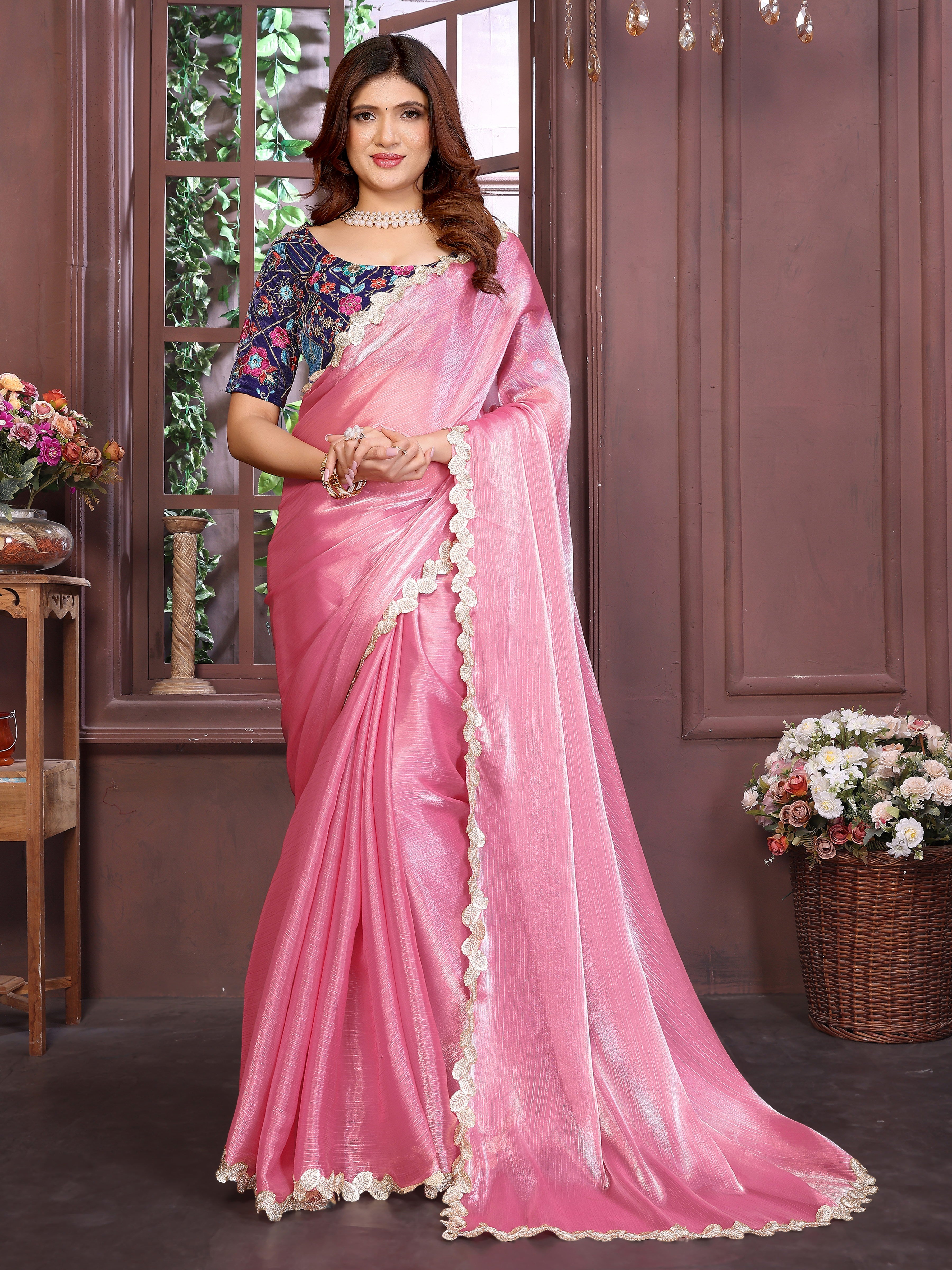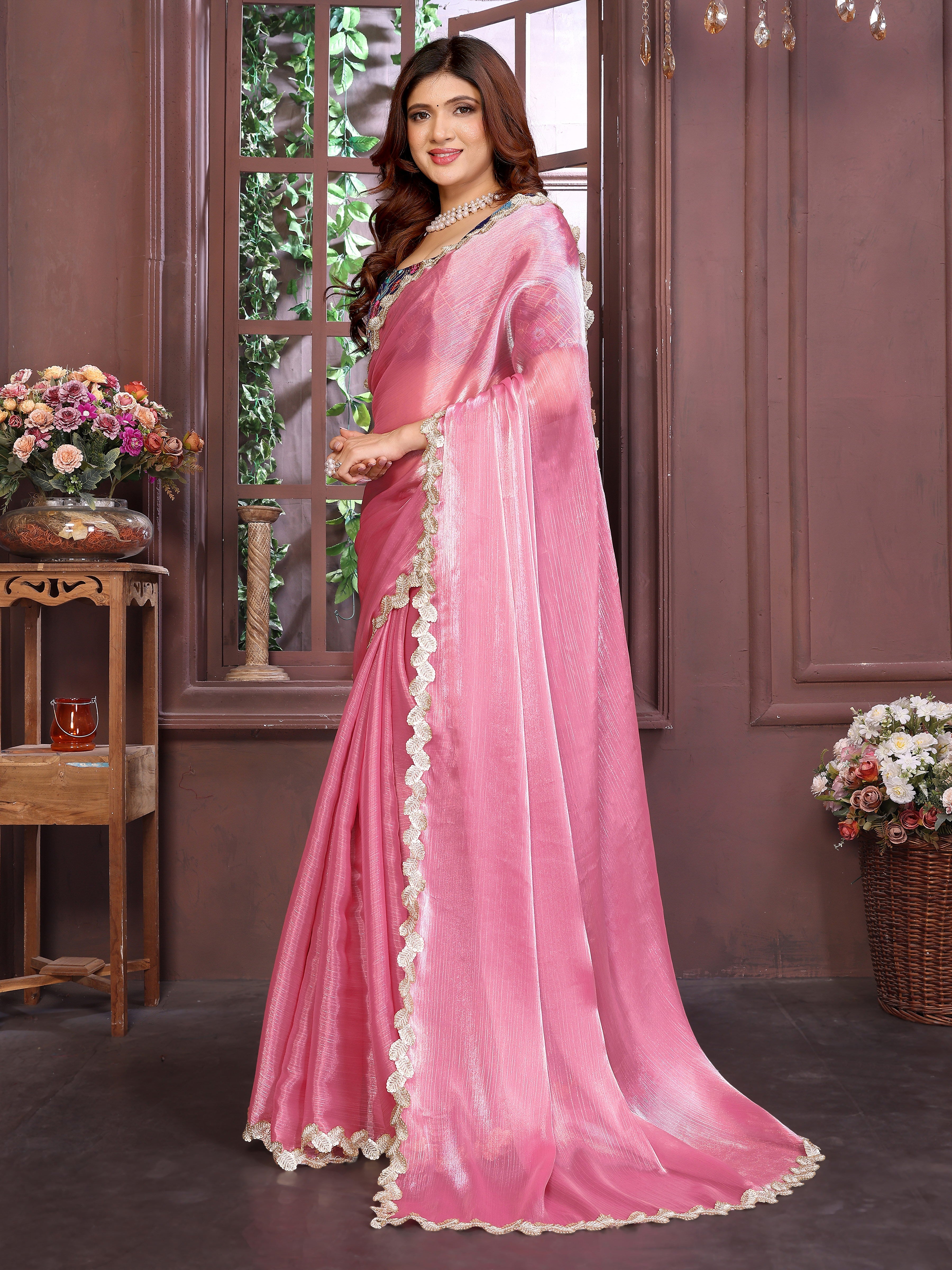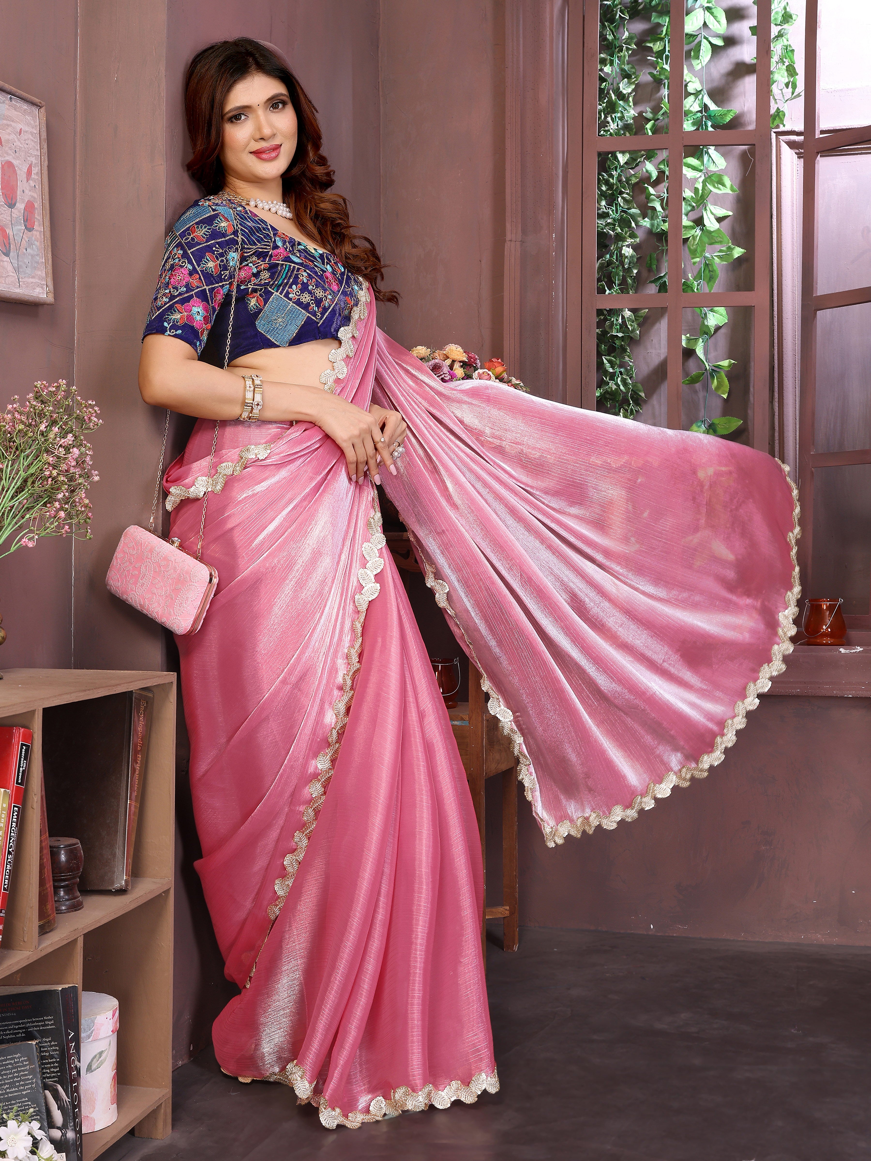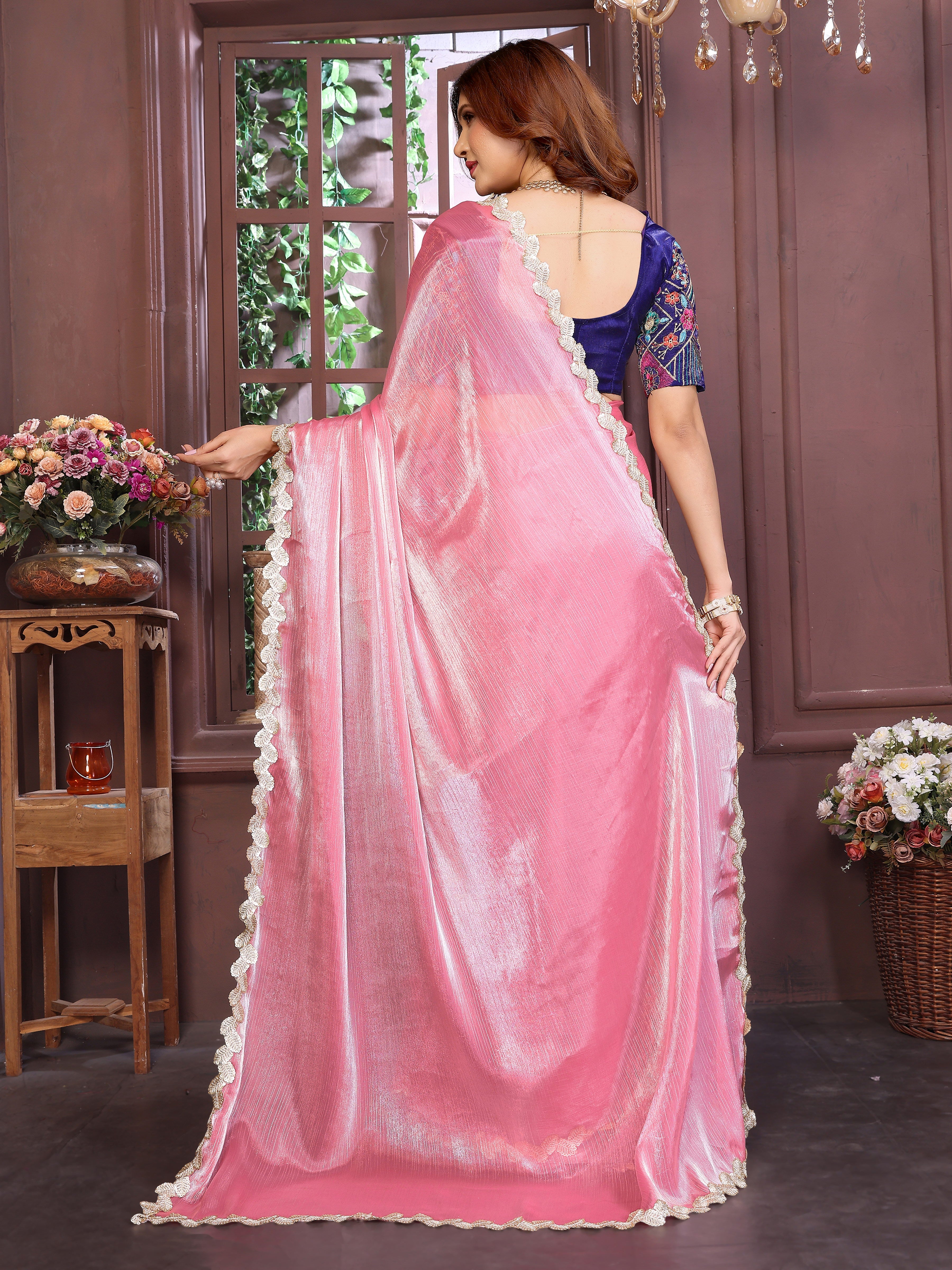 Shine bright in this stunning pink saree featuring elegant Satin silk sequence work and delicate lace detailing. Perfect for parties, weddings, and festive occasions, it blends glam with grace in every drape.