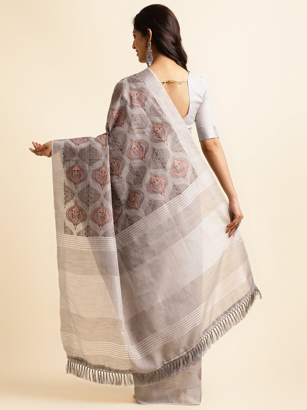 wCrafted for comfort and style, this Platinum Grey Linen Cotton Embroidery Saree is soft, lightweight, and breathable—perfect for all-day wear. The elegant woven embroidery saaree adds a refined touch, making it a versatile choice for both everyday elegance and special occasions.