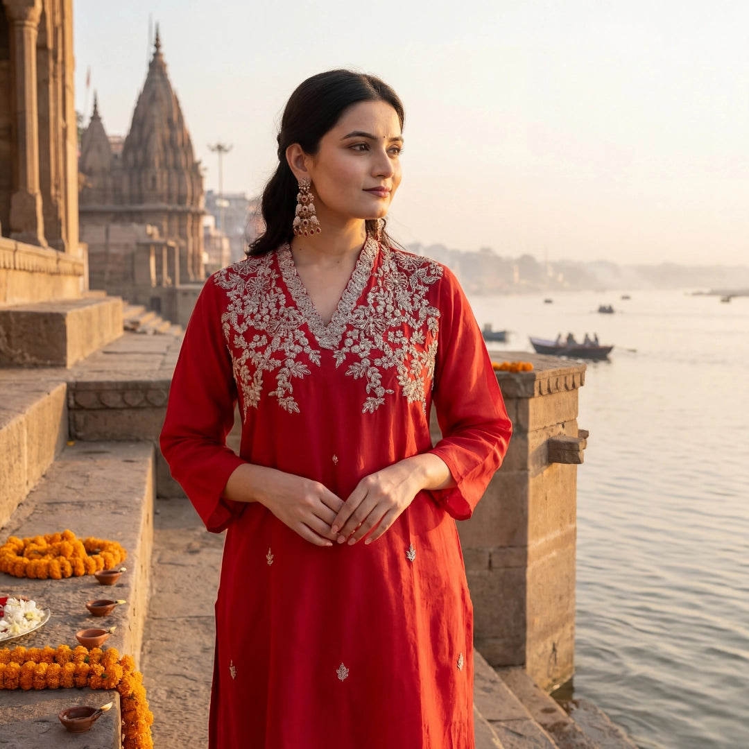 The red tone with delicate embroidery gives you that effortless, graceful look.