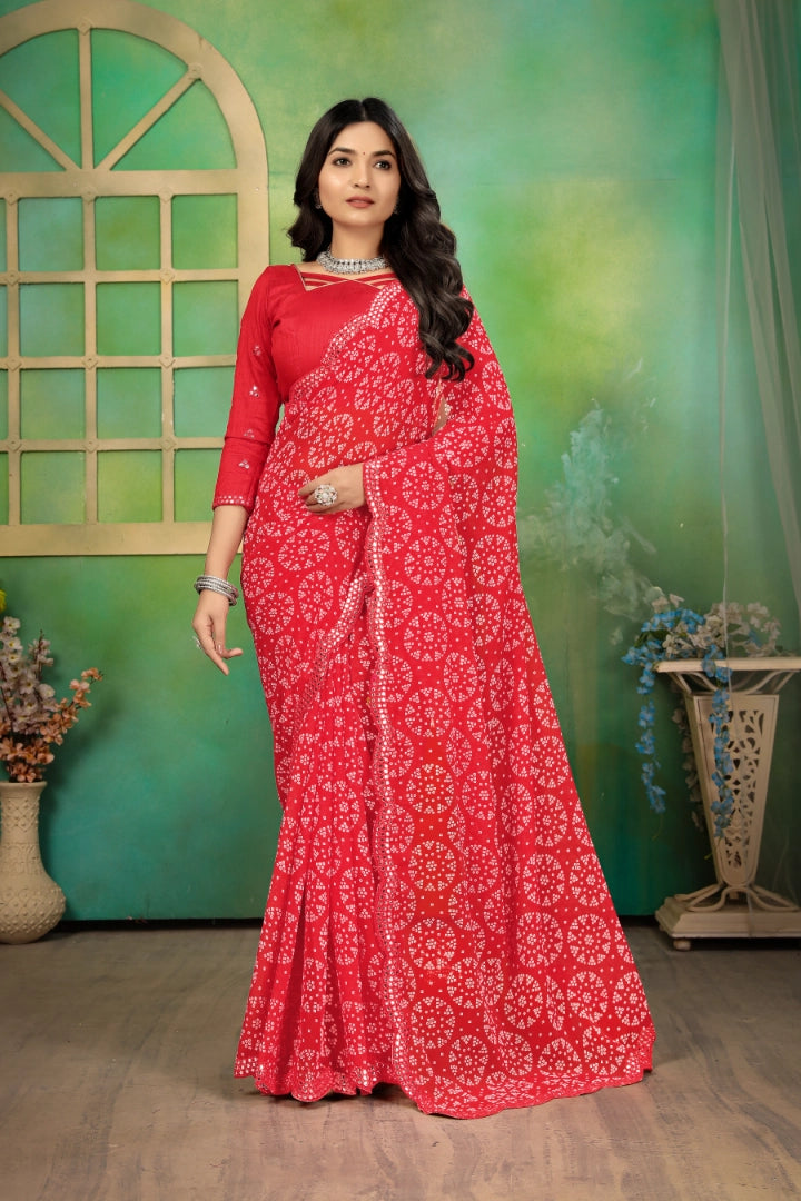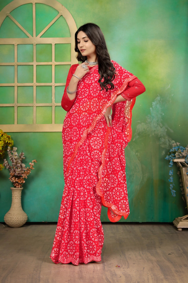 Georgette bandhej (bandhani) mirror work sarees are a beautiful combination of traditional tie-dye craftsmanship and intricate mirror Particles embeded with saree. They are lightweight, flowy, and perfect for festive occasions, weddings, and cultural events.