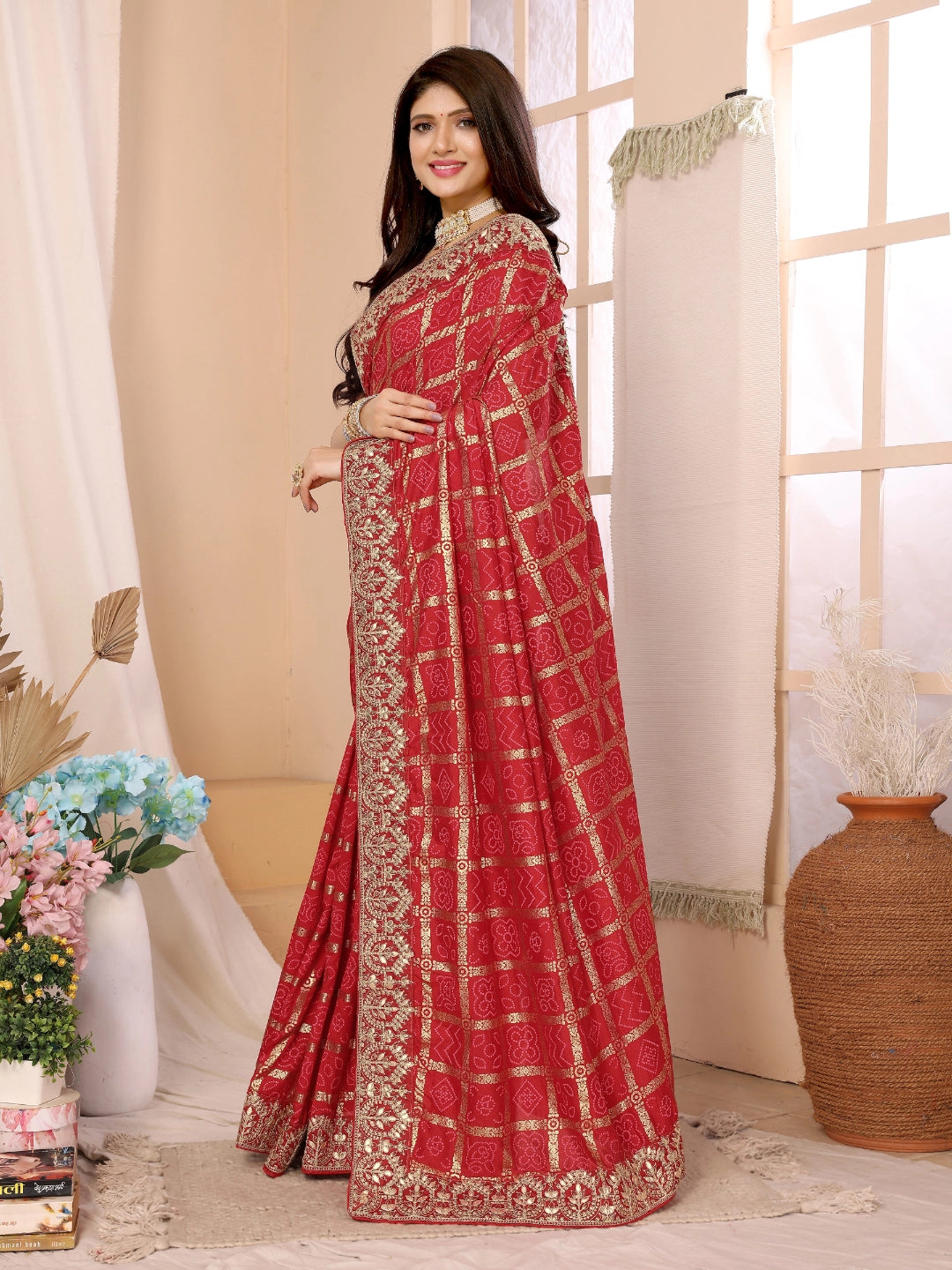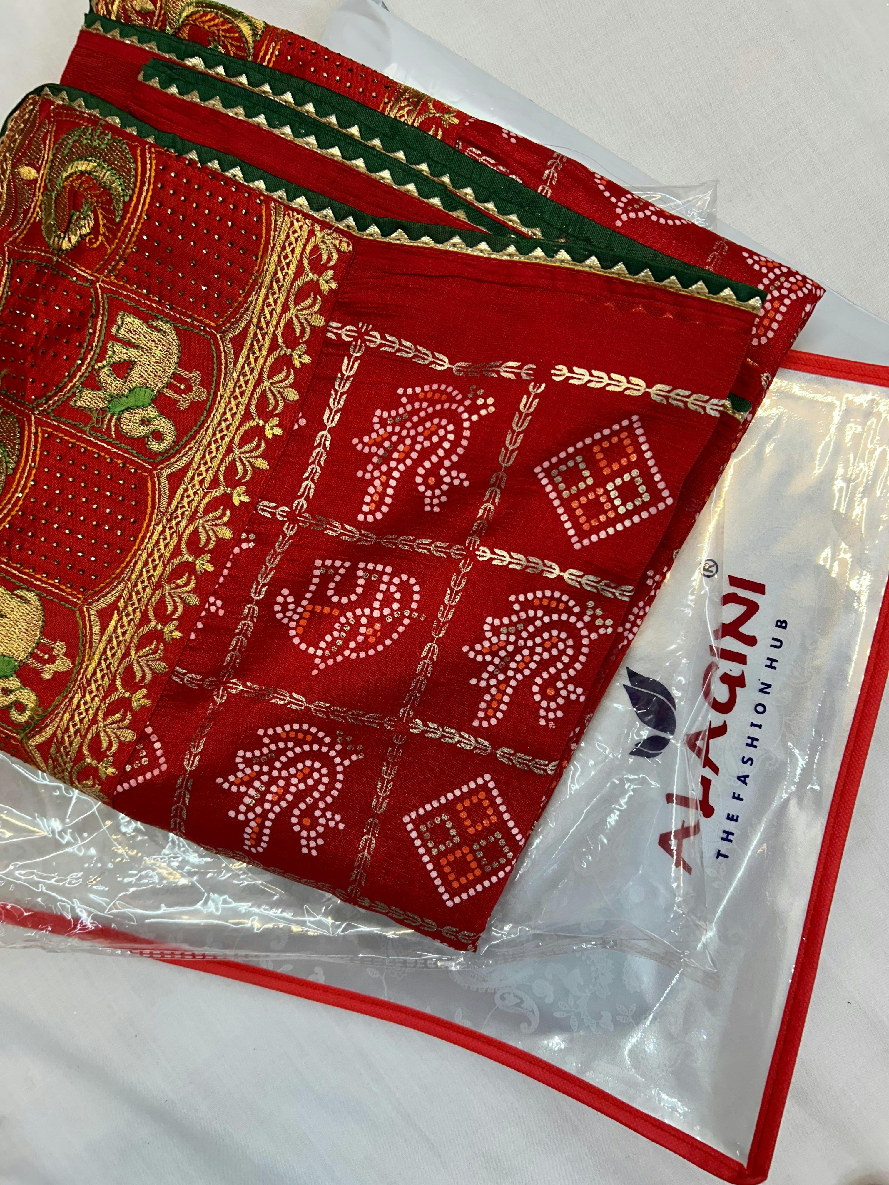 Celebrate the Festival in the opulent glow of this Red Vichitra Silk Traditional Bandhani Saree. The auspicious red hue is deeply symbolic of prosperity and power, making it the perfect attire for Wedding night. Crafted from richly textured Vichitra silk, the saree catches the light beautifully, mirroring the glow of a thousand diyas.