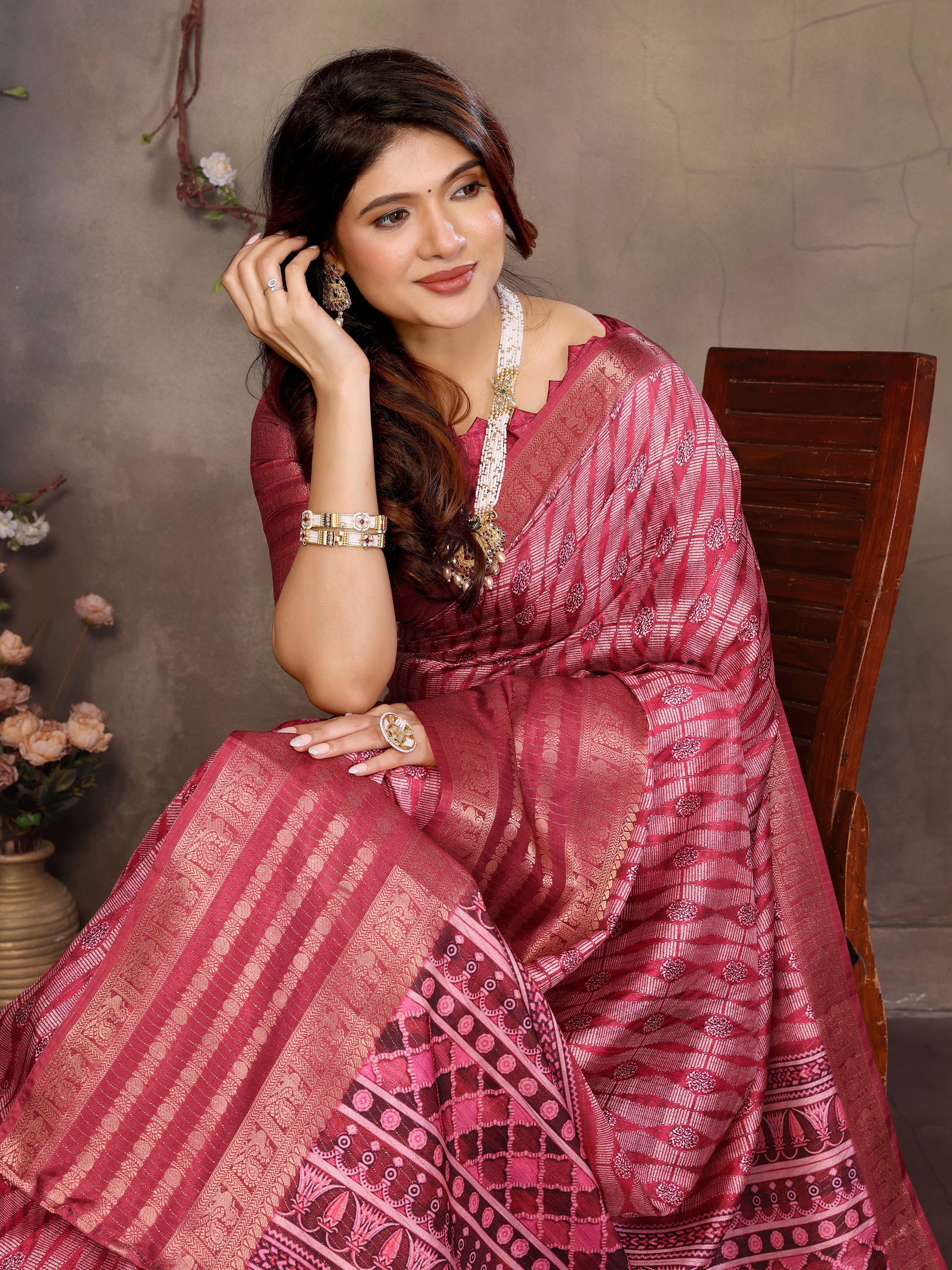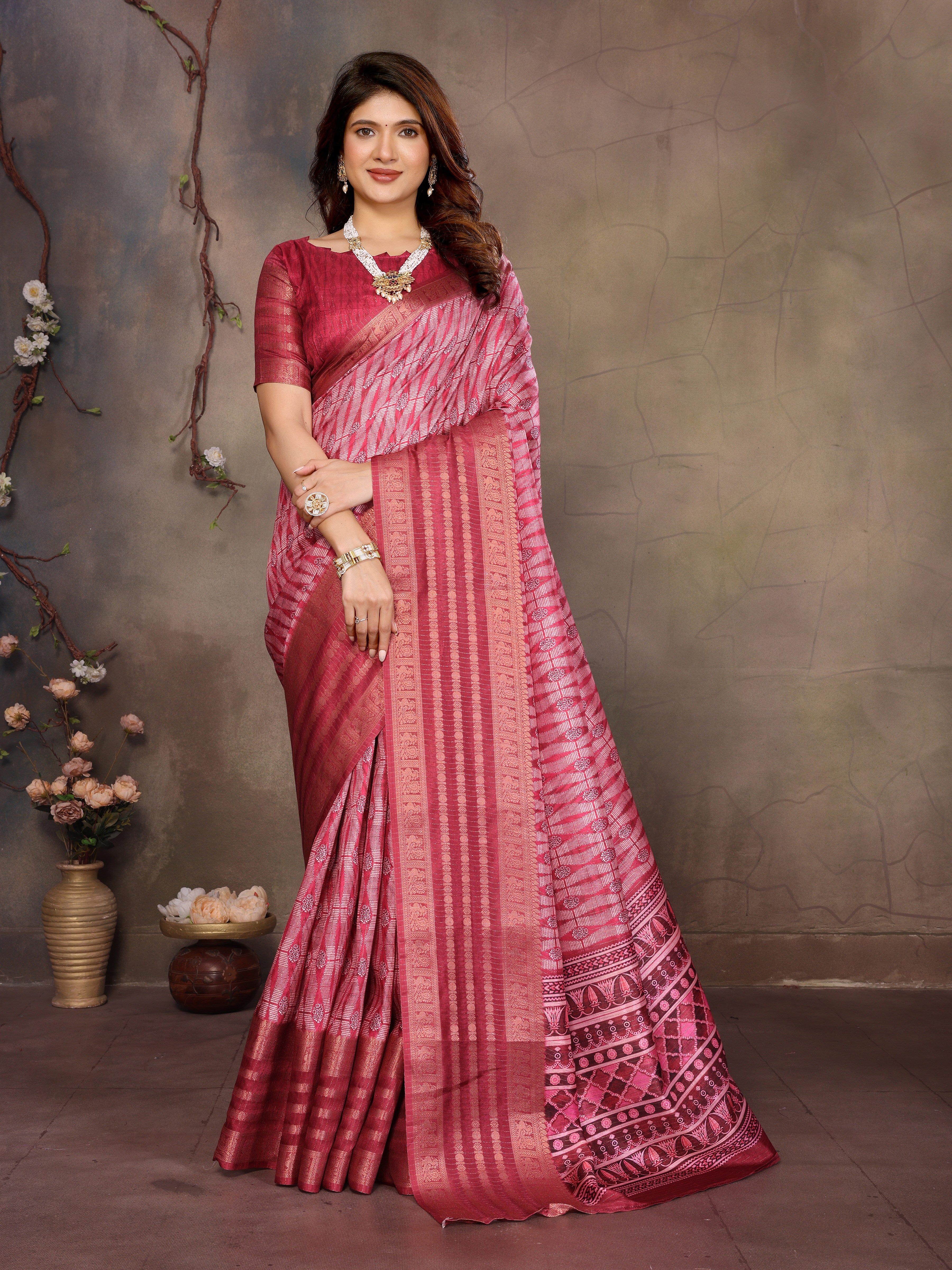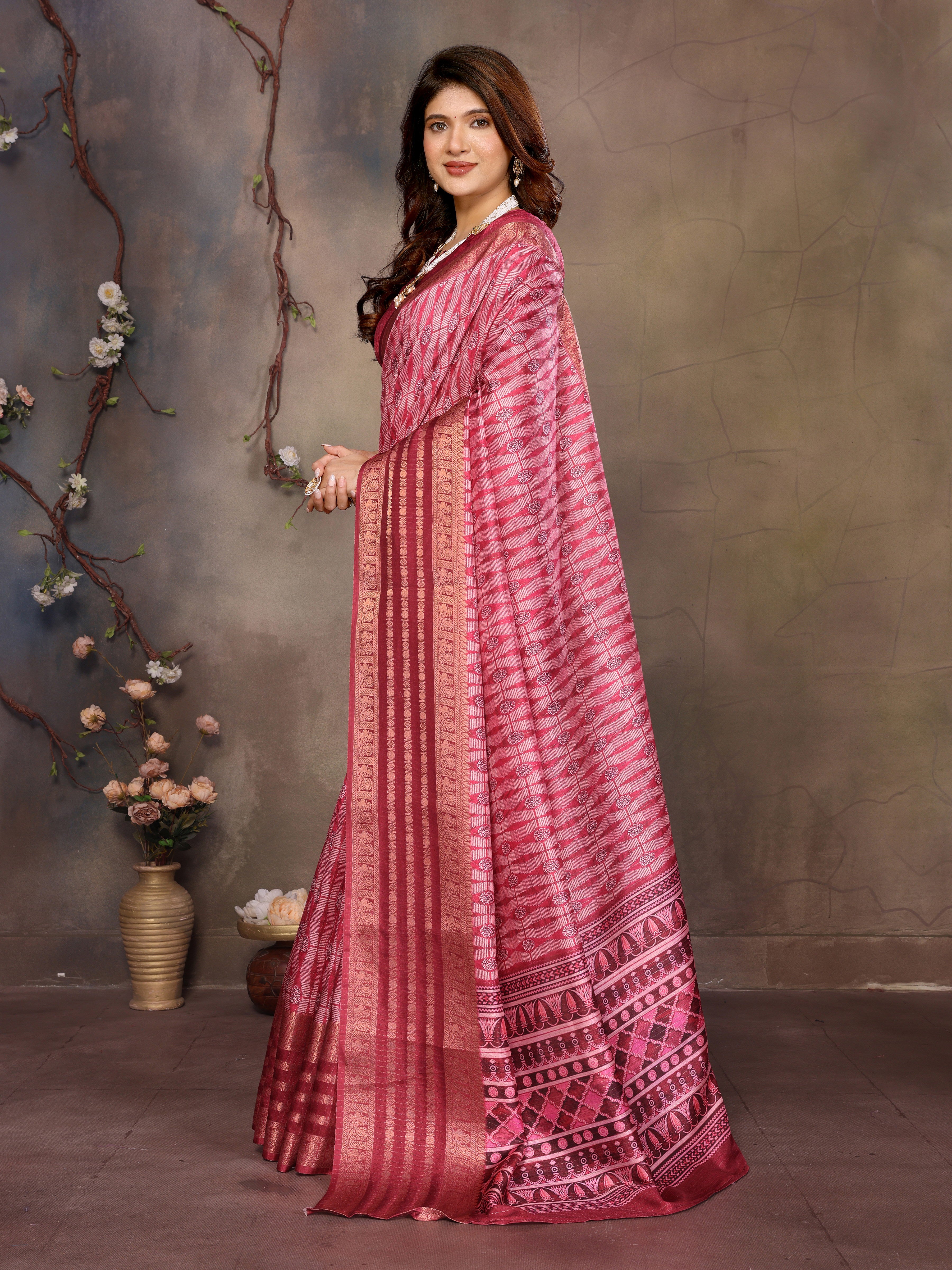Step into timeless elegance with this Banarasi Jacquard saree featuring bold geometric digital prints. The soft jacquard fabric is woven with subtle shine and classic Banarasi-style motifs, offering a perfect blend of tradition and modern aesthetics.