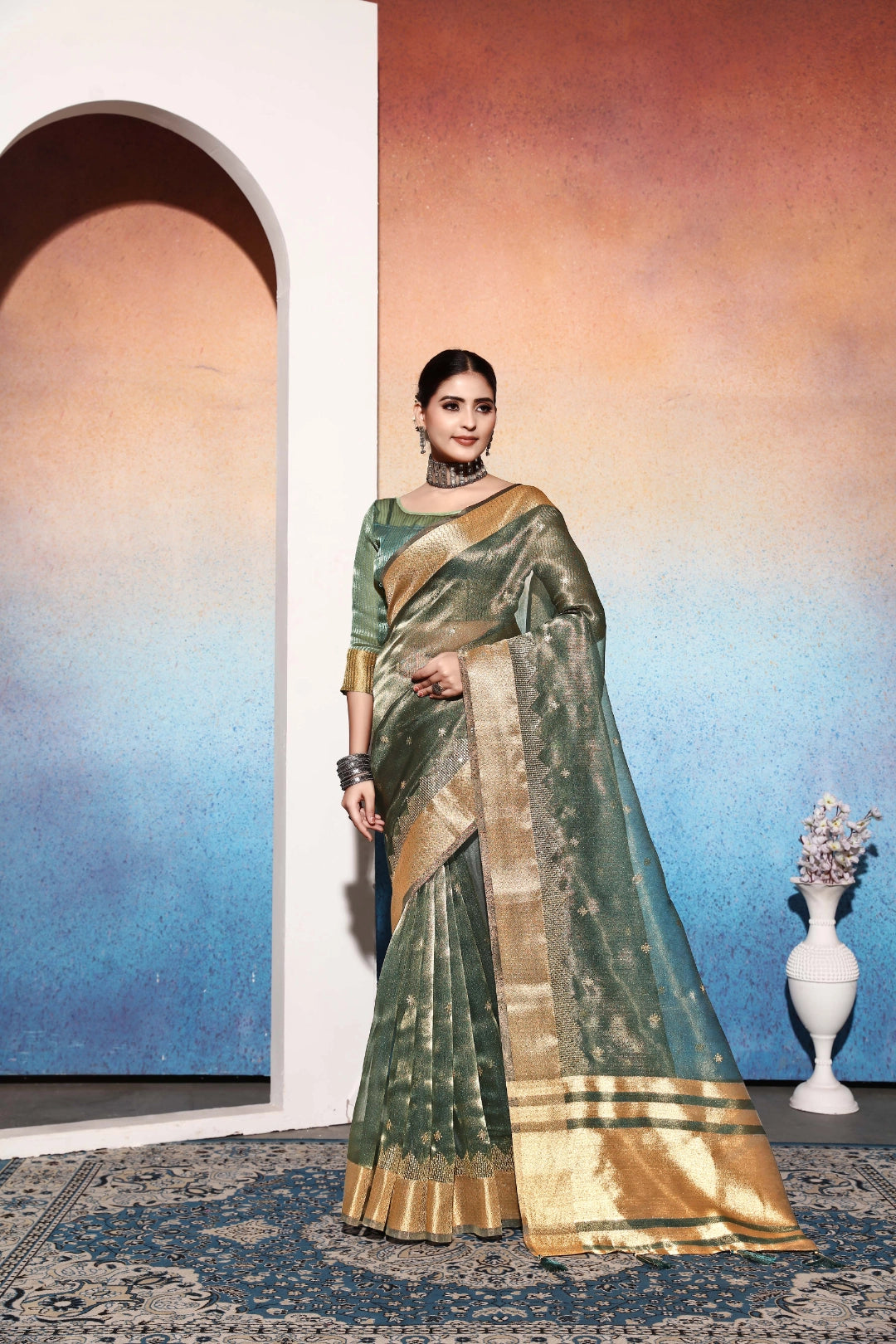 The Green Tissue Cotton Silk Sequins Embroidery Saree is a graceful blend of soft cotton silk and shimmering tissue fabric. Adorned with subtle sequin embroidery, it offers a delicate sparkle, making it ideal for festive and elegant occasions.