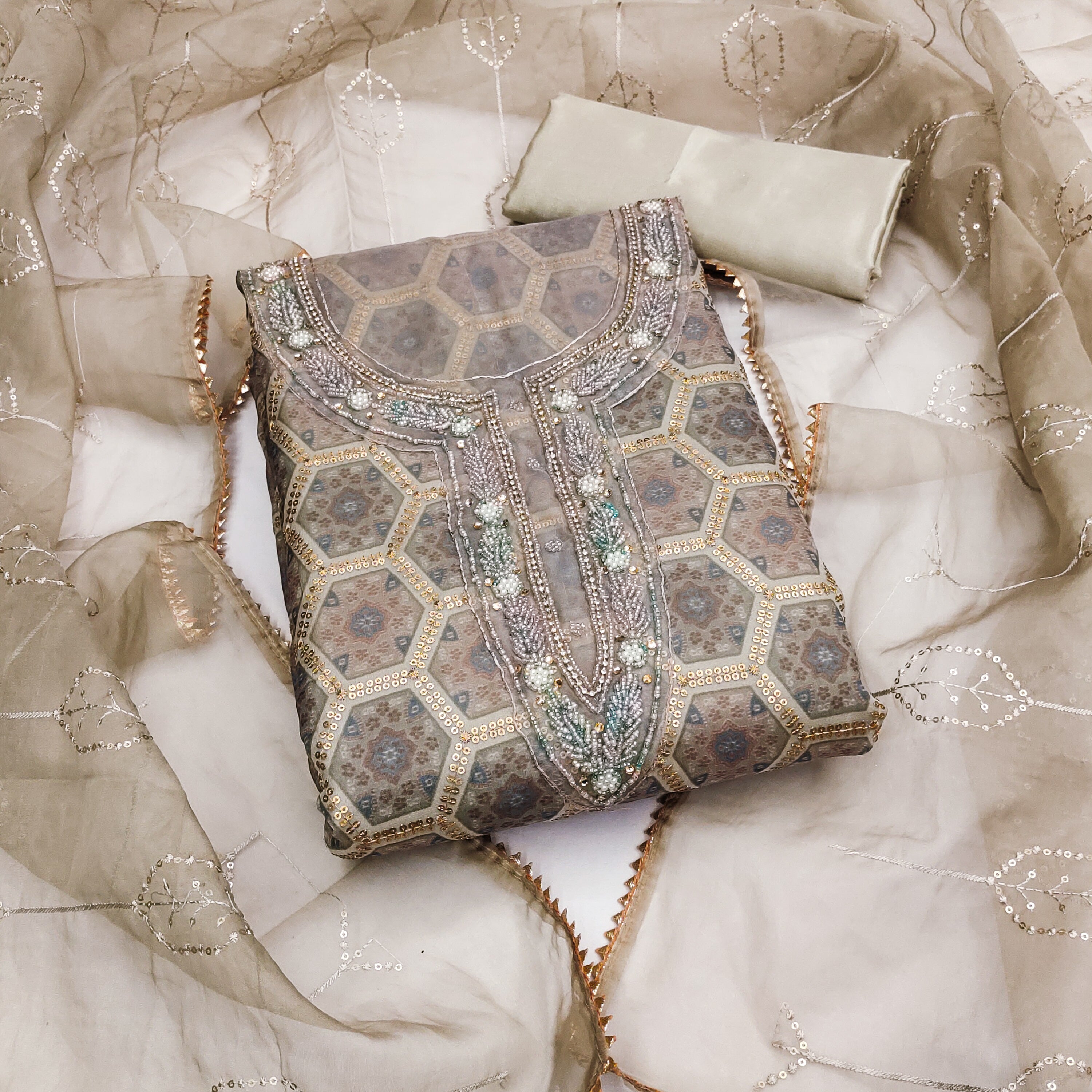 Graceful and light – this soft beige organza suit is designed to make you feel special. It features neat handwork placed beautifully on the fabric. A lovely choice for festive events, family functions, or even a classy day out.