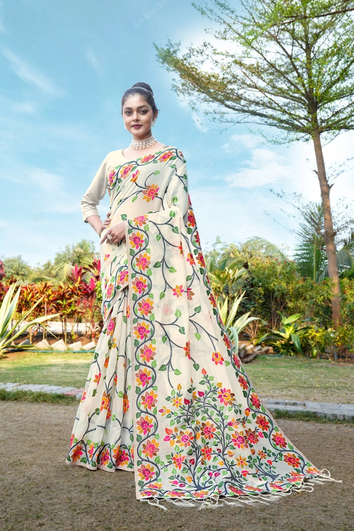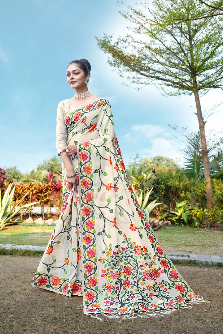 Our WHITE Floral Jamdani Saree is a perfect blend of tradition and elegance, with vibrant flower patterns woven into soft fabric. It offers a smooth, comfortable fit that works for both formal and casual events