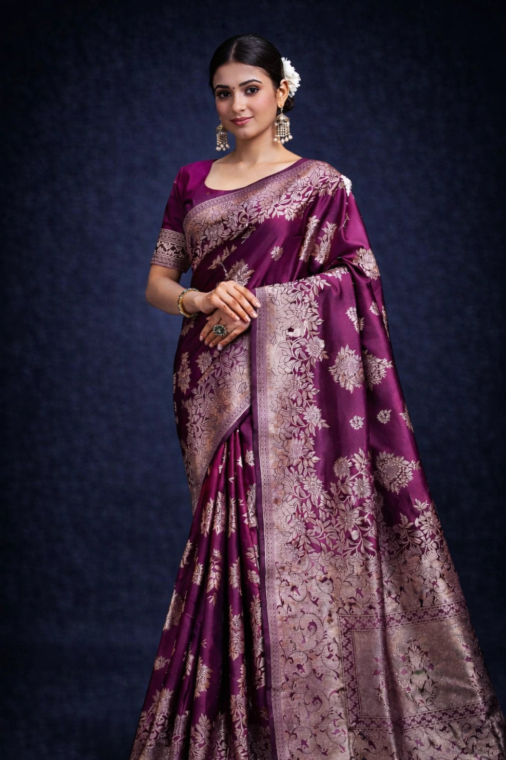 Made from Banarasi silk, the saree features gold zari floral weaving that adds a touch of elegance. The broad zari border and detailed pallu enhance its traditional appeal, while the soft silk fabric gives a smooth fall and subtle shine