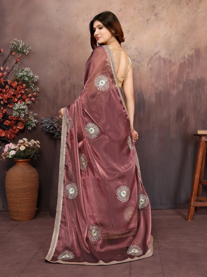 Crafted in flowy chiffon and highlighted with delicate Gotta Patti embroidery, this saree blends comfort with elegance—ideal for evening parties or festive celebrations.