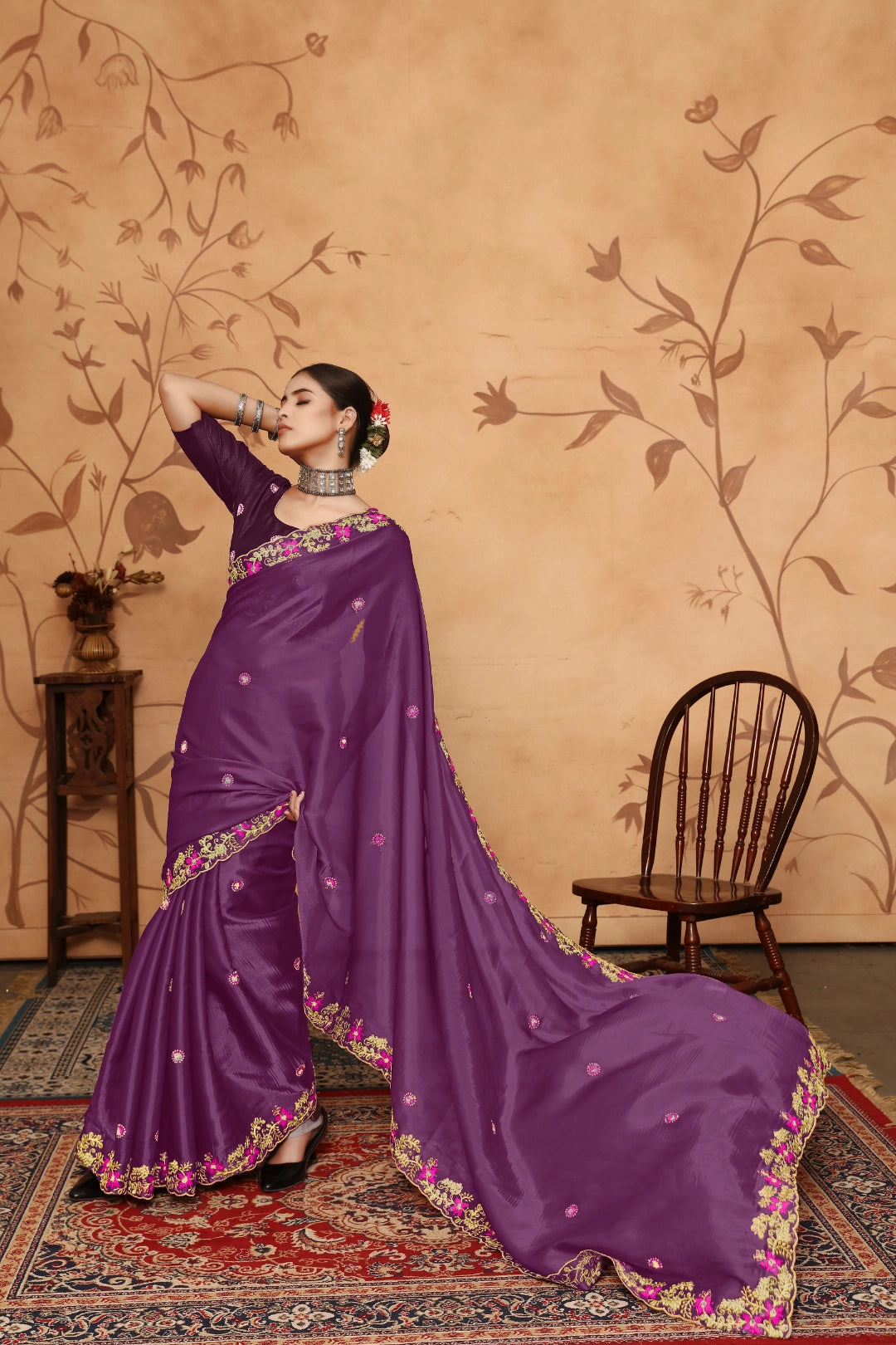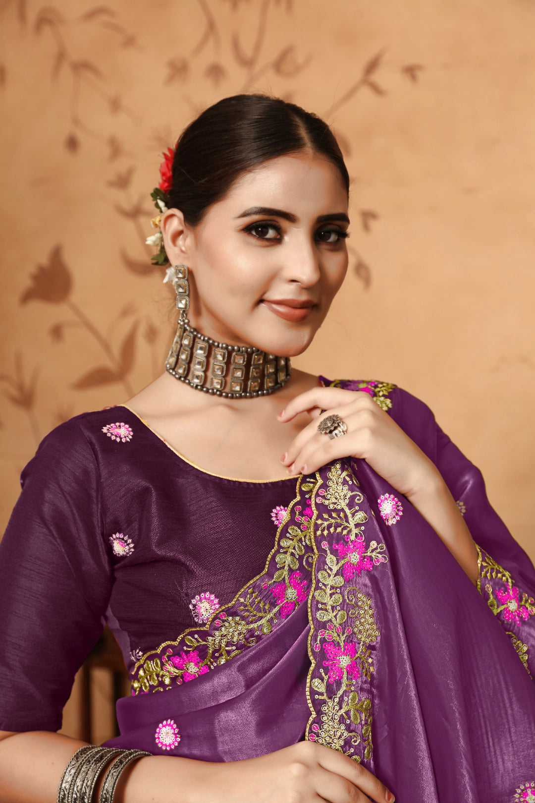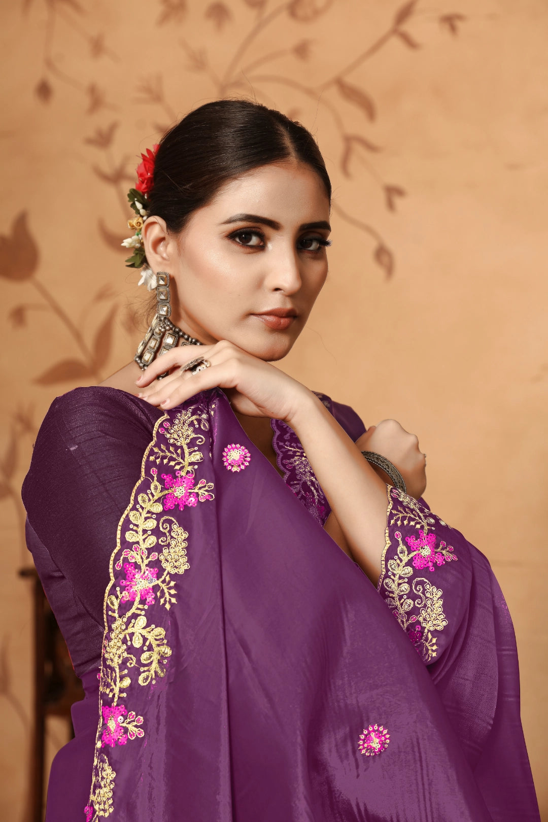 A perfect blend of glamour and tradition, this saree showcases floral embroidery enhanced with subtle sequins. The soft fabric offers comfort and elegance, while the detailed design adds a modern twist to the classic saree.
