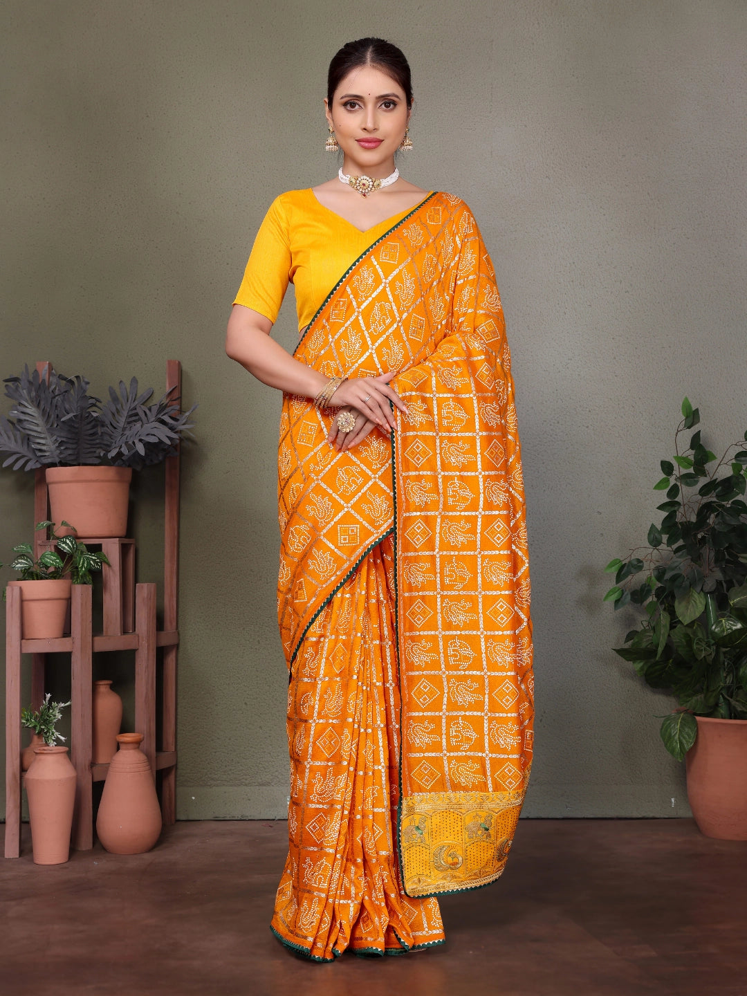A Gujarati Bandhej Hand Print Saree with Kutchi Embroidery is a timeless, elegant piece that showcases traditional craftsmanship with a modern touch allows you to stand out in any occasion or offering.