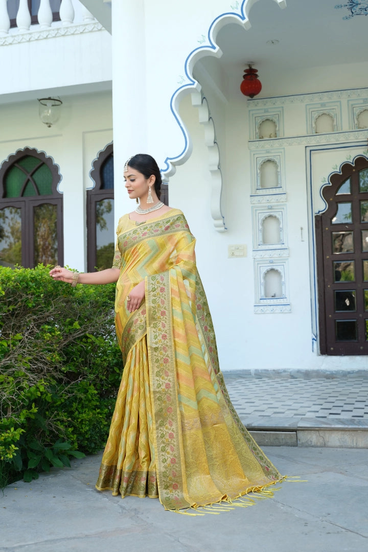 Enhance your look with our YELLOW Organza Lehriya Saree, featuring colorful, wavy patterns for a fresh and stylish vibe. Made from lightweight organza, it flows beautifully for a graceful fit.